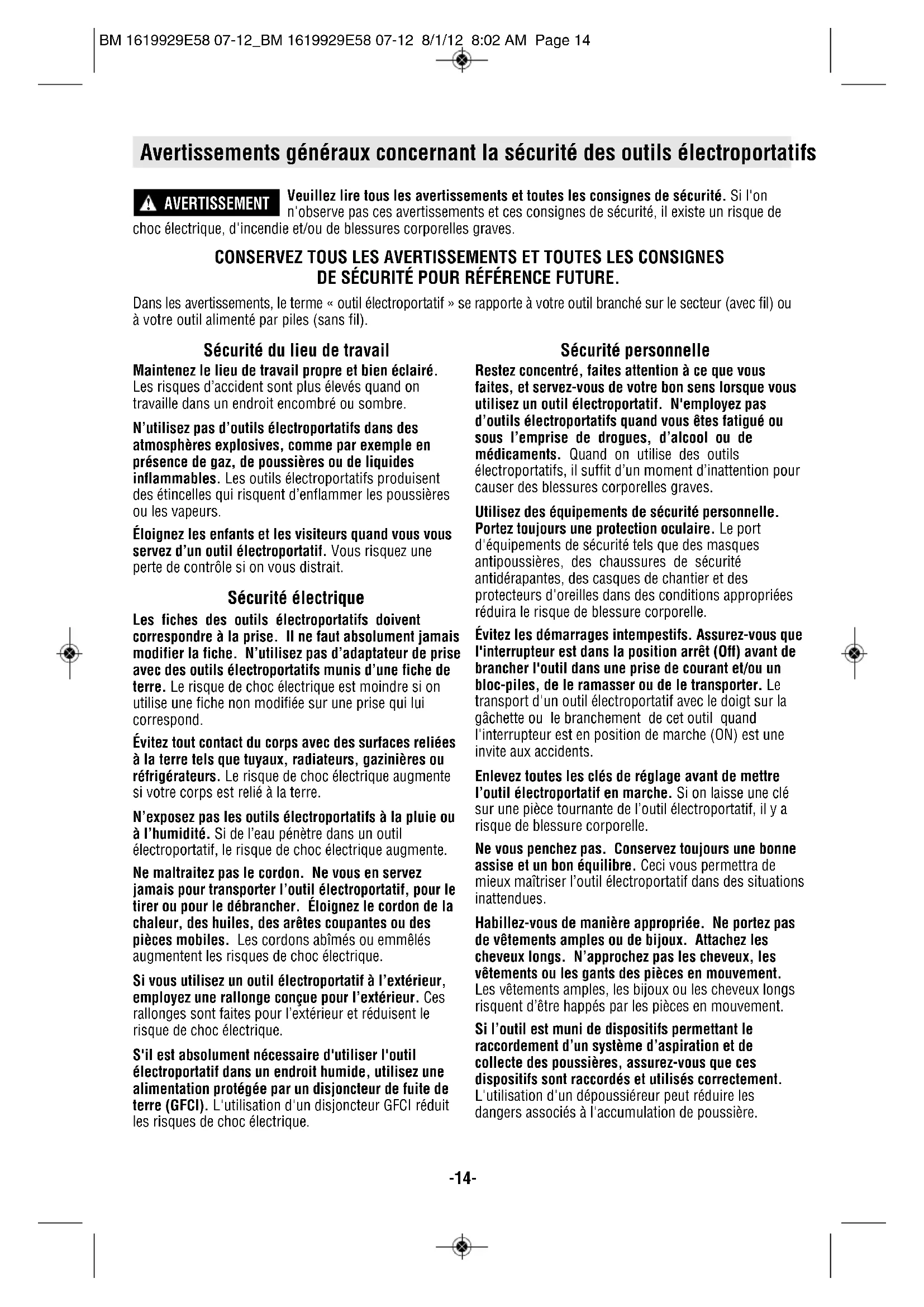 WARNING BM 1619929E58 07-12_BM 1619929E58 07-12 8/1/12 8:02 AM Page 13-14- Veuillez lire tous les avertissements et toutes les consignes de sécurité. Si l'on n'observe pas ces avertissements et ces consignes de sécurité, il existe un risque de choc électrique, d'incendie et/ou de blessures corporelles graves. CONSERVEZ TOUS LES AVERTISSEMENTS ET TOUTES LES CONSIGNES DE SÉCURITÉ POUR RÉFÉRENCE FUTURE. Dans les avertissements, le terme « outil électroportatif » se rapporte à votre outil branché sur le secteur (avec fil) ou à votre outil alimenté par piles (sans fil). Avertissements généraux concernant la sécurité des outils électroportatifs AVERTISSEMENT