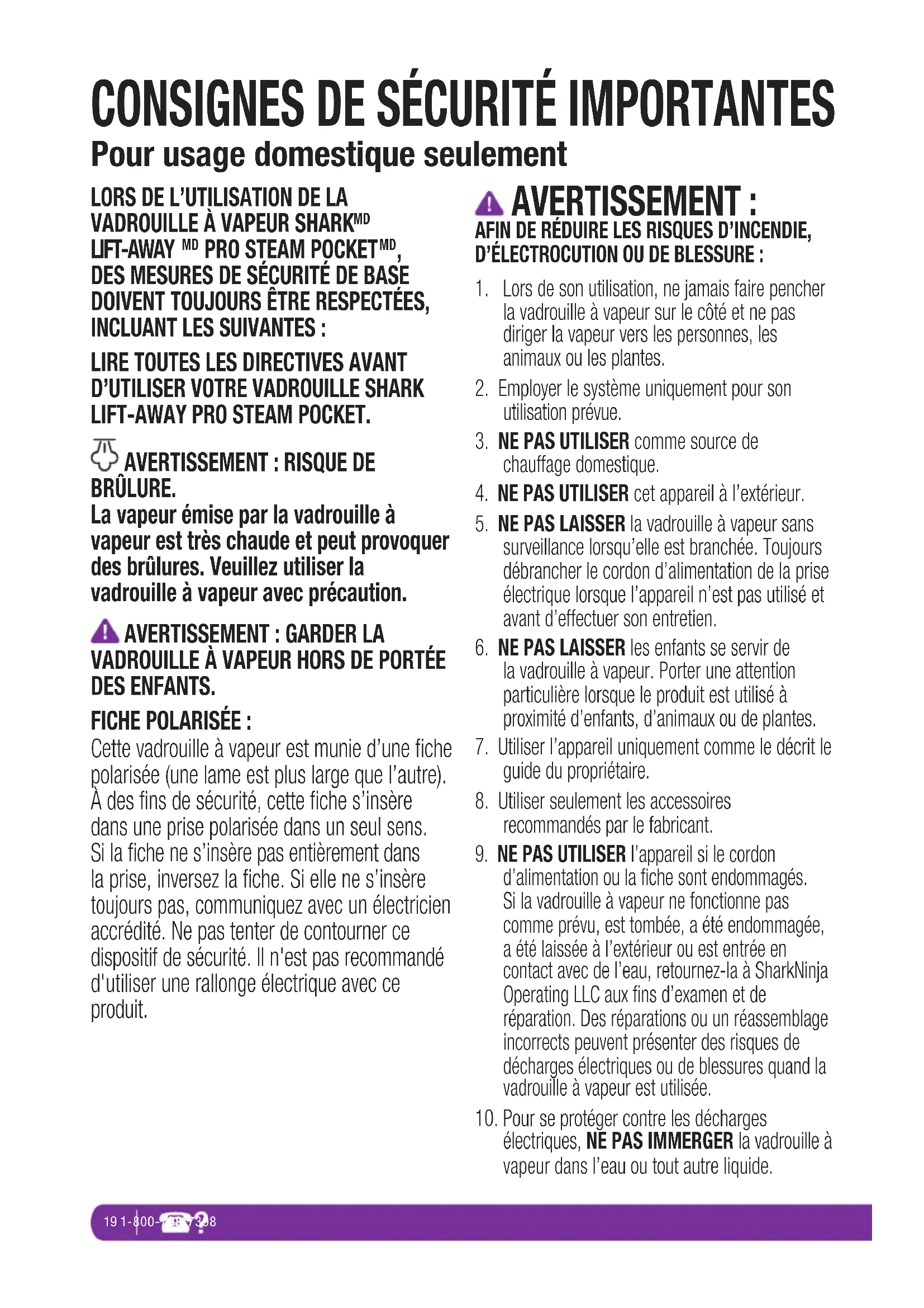 d’alimentation ou la fiche sont endommagés. Si la vadrouille à vapeur ne fonctionne pas comme prévu, est tombée, a été endommagée, a été laissée à l’extérieur ou est entrée en contact avec de l’eau, retournez-la à SharkNinja Operating LLC aux fins d’examen et de réparation. Des réparations ou un réassemblage incorrects peuvent présenter des risques de décharges électriques ou de blessures quand la vadrouille à vapeur est utilisée.
