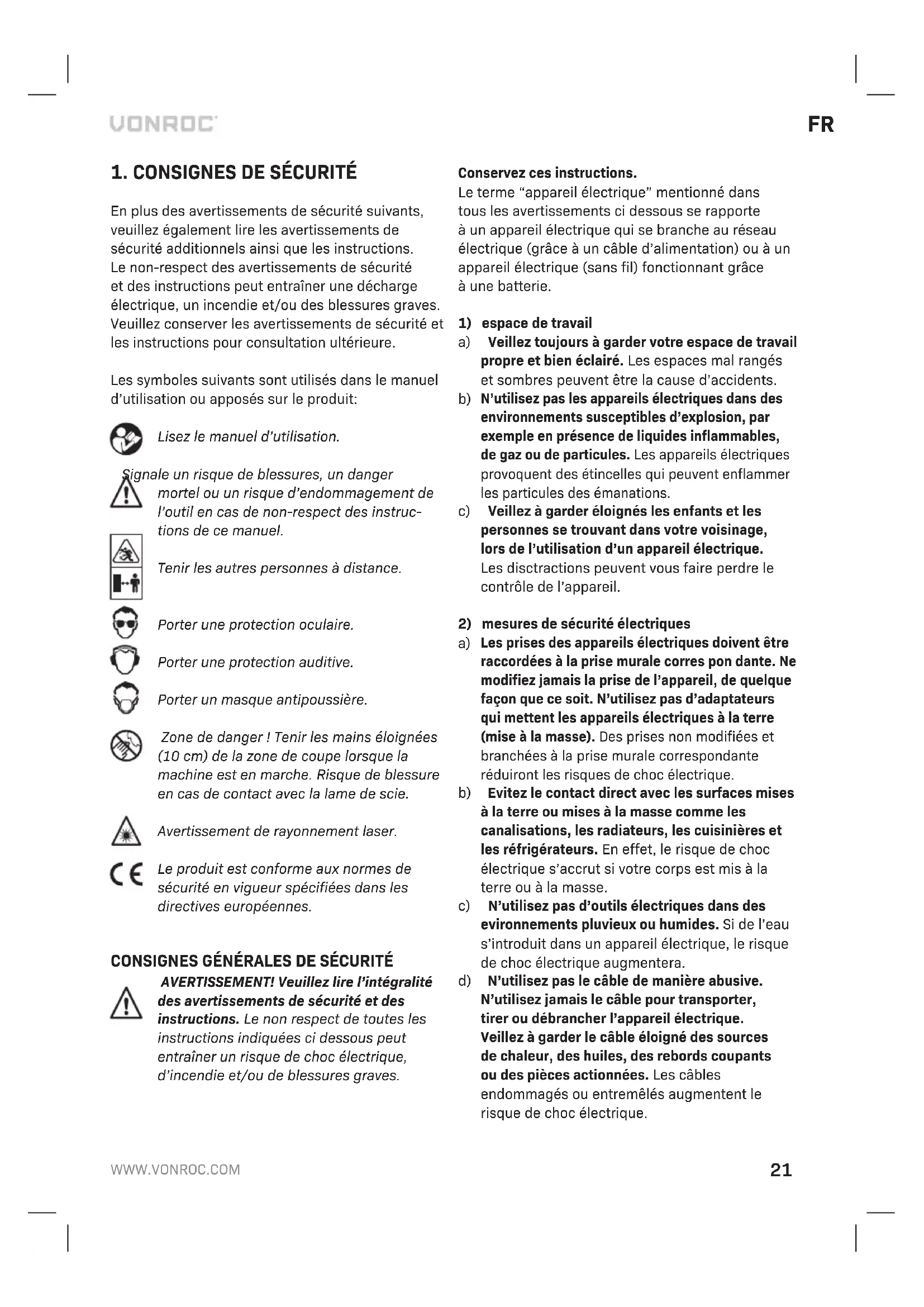 En plus des avertissements de sécurité suivants, veuillez également lire les avertissements de sécurité additionnels ainsi que les instructions. Le non-respect des avertissements de sécurité et des instructions peut entraîner une décharge électrique, un incendie et/ou des blessures graves. Veuillez conserver les avertissements de sécurité et les instructions pour consultation ultérieure. Les symboles suivants sont utilisés dans le manuel d’utilisation ou apposés sur le produit: Lisez le manuel d’utilisation. Signale un risque de blessures, un danger mortel ou un risque d’endommagement de l’outil en cas de non-respect des instruc- tions de ce manuel. Tenir les autres personnes àdistance. Porter une protection oculaire. Porter une protection auditive. Porter un masque antipoussière. Zone de danger ! Tenir les mains éloignées (10 cm) de la zone de coupe lorsque la machine est en marche. Risque de blessure en cas de contact avec la lame de scie. Avertissement de rayonnement laser. Le produit est conforme aux normes de sécurité en vigueur spécifiées dans les directives européennes. CONSIGNES GÉNÉRALES DE SÉCURITÉ AVERTISSEMENT! Veuillez lire l’intégralité des avertissements de sécurité et des instructions. Le non respect de toutes les instructions indiquées ci dessous peut entraîner un risque de choc électrique, d’incendie et/ou de blessures graves. Conservez ces instructions. Le terme “appareil électrique” mentionné dans tous les avertissements ci dessous se rapporte àun appareil électrique qui se branche au réseau électrique (grâce àun câble d’alimentation) ou àun appareil électrique (sans fil) fonctionnant grâce àune batterie.