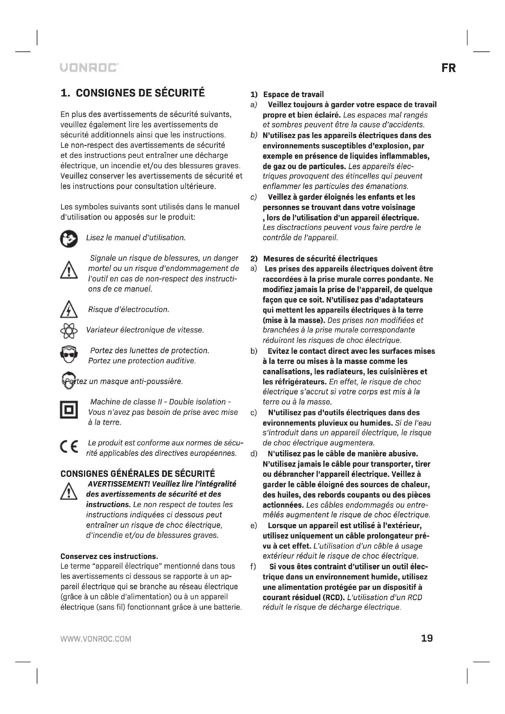 En plus des avertissements de sécurité suivants, veuillez également lire les avertissements de sécurité additionnels ainsi que les instructions. Le non-respect des avertissements de sécurité et des instructions peut entraîner une décharge électrique, un incendie et/ou des blessures graves. Veuillez conserver les avertissements de sécurité et les instructions pour consultation ultérieure. Les symboles suivants sont utilisés dans le manuel d’utilisation ou apposés sur le produit: Lisez le manuel d’utilisation. Signale un risque de blessures, un danger mortel ou un risque d’endommagement de l’outil en cas de non-respect des instructi- ons de ce manuel. Risque d’électrocution. Variateur électronique de vitesse. Portez des lunettes de protection. Portez une protection auditive. Portez un masque anti-poussière. Machine de classe II - Double isolation - Vous n’avez pas besoin de prise avec mise à la terre. Le produit est conforme aux normes de sécu- rité applicables des directives européennes. CONSIGNES GÉNÉRALES DE SÉCURITÉ AVERTISSEMENT! Veuillez lire l’intégralité des avertissements de sécurité et des instructions. Le non respect de toutes les instructions indiquées ci dessous peut entraîner un risque de choc électrique, d’incendie et/ou de blessures graves. Conservez ces instructions. Le terme “appareil électrique” mentionné dans tous les avertissements ci dessous se rapporte à un ap- pareil électrique qui se branche au réseau électrique (grâce à un câble d’alimentation) ou à un appareil électrique (sans fil) fonctionnant grâce à une batterie.