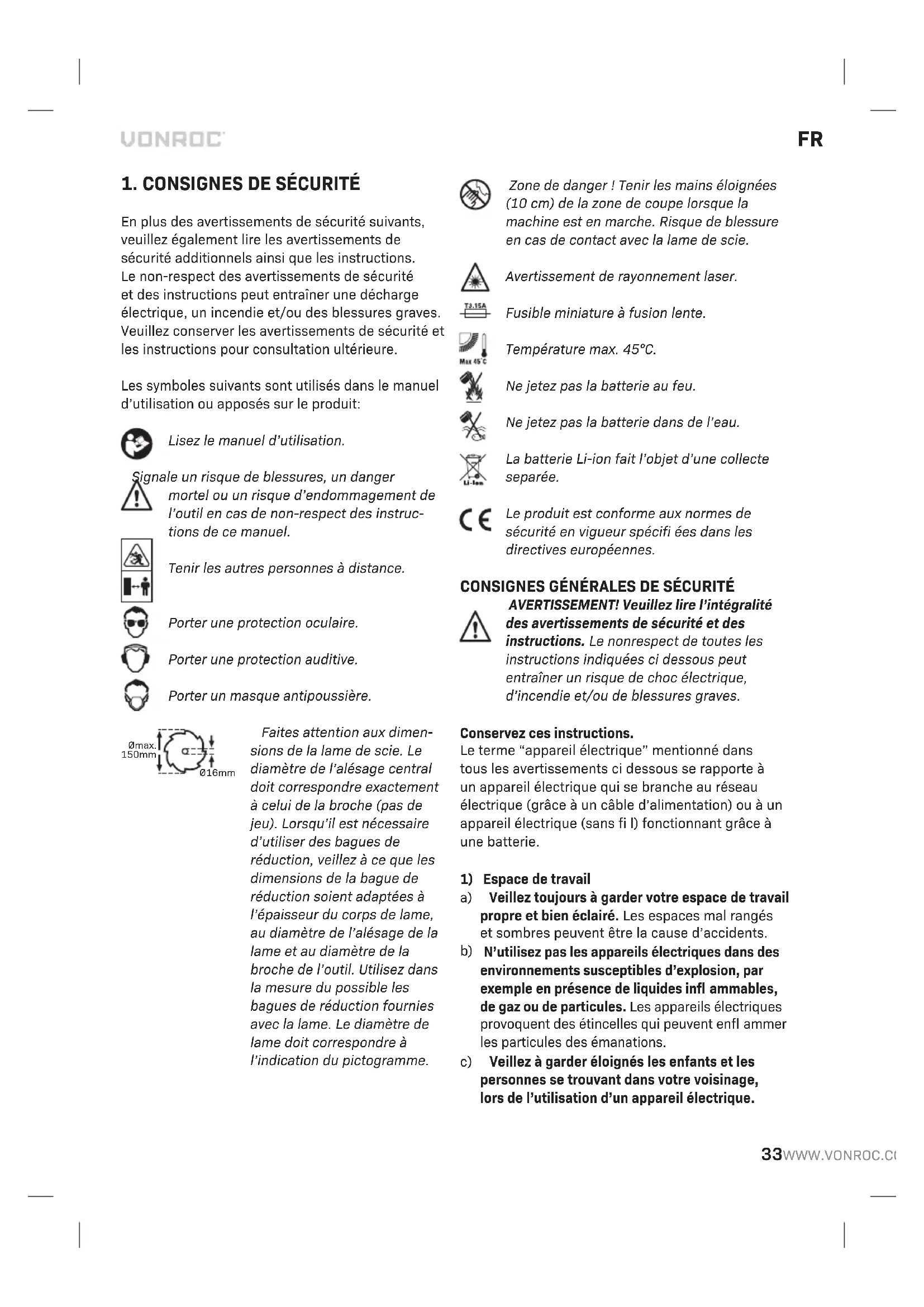 En plus des avertissements de sécurité suivants, veuillez également lire les avertissements de sécurité additionnels ainsi que les instructions. Le non-respect des avertissements de sécurité et des instructions peut entraîner une décharge électrique, un incendie et/ou des blessures graves. Veuillez conserver les avertissements de sécurité et les instructions pour consultation ultérieure. Les symboles suivants sont utilisés dans le manuel d’utilisation ou apposés sur le produit: Lisez le manuel d’utilisation. Signale un risque de blessures, un danger mortel ou un risque d’endommagement de l’outil en cas de non-respect des instruc- tions de ce manuel. Tenir les autres personnes à distance. Porter une protection oculaire. Porter une protection auditive. Porter un masque antipoussière. Ø16mmØmax.150mm Faites attention aux dimen- sions de la lame de scie. Le diamètre de l’alésage central doit correspondre exactement à celui de la broche (pas de jeu). Lorsqu’il est nécessaire d’utiliser des bagues de réduction, veillez à ce que les dimensions de la bague de réduction soient adaptées à l’épaisseur du corps de lame, au diamètre de l’alésage de la lame et au diamètre de la broche de l’outil. Utilisez dans la mesure du possible les bagues de réduction fournies avec la lame. Le diamètre de lame doit correspondre à l’indication du pictogramme. Zone de danger ! Tenir les mains éloignées (10 cm) de la zone de coupe lorsque la machine est en marche. Risque de blessure en cas de contact avec la lame de scie. Avertissement de rayonnement laser. Fusible miniature à fusion lente. Température max. 45°C. Ne jetez pas la batterie au feu. Ne jetez pas la batterie dans de l’eau. La batterie Li-ion fait l’objet d’une collecte separée. Le produit est conforme aux normes de sécurité en vigueur spécifi ées dans les directives européennes. CONSIGNES GÉNÉRALES DE SÉCURITÉ AVERTISSEMENT! Veuillez lire l’intégralité des avertissements de sécurité et des instructions. Le non respect de toutes les instructions indiquées ci dessous peut entraîner un risque de choc électrique, d’incendie et/ou de blessures graves. Conservez ces instructions. Le terme “appareil électrique” mentionné dans tous les avertissements ci dessous se rapporte à un appareil électrique qui se branche au réseau électrique (grâce à un câble d’alimentation) ou à un appareil électrique (sans fi l) fonctionnant grâce à une batterie.