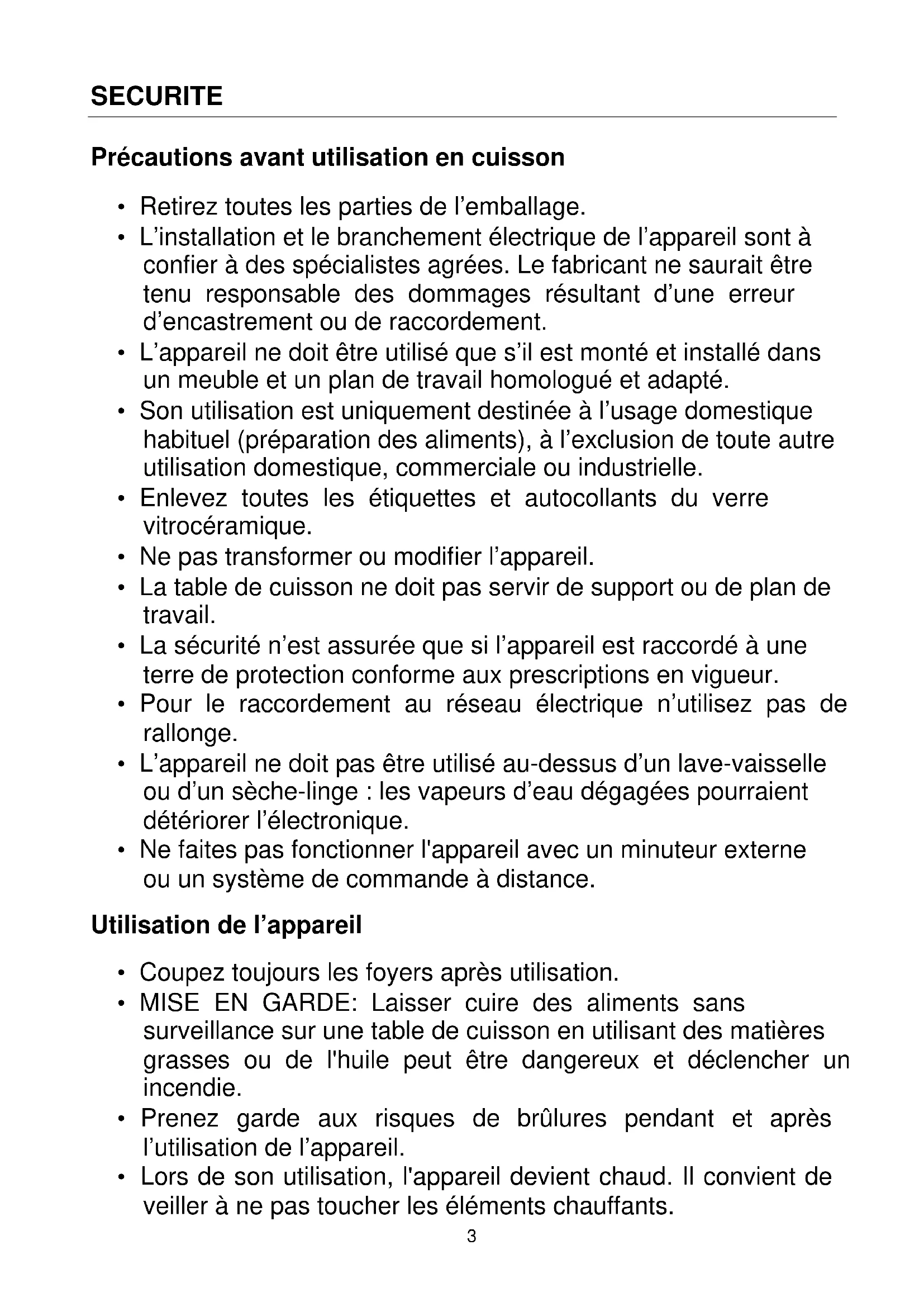 - La table de cuisson ne doit pas servir de support ou de plan de travail.
