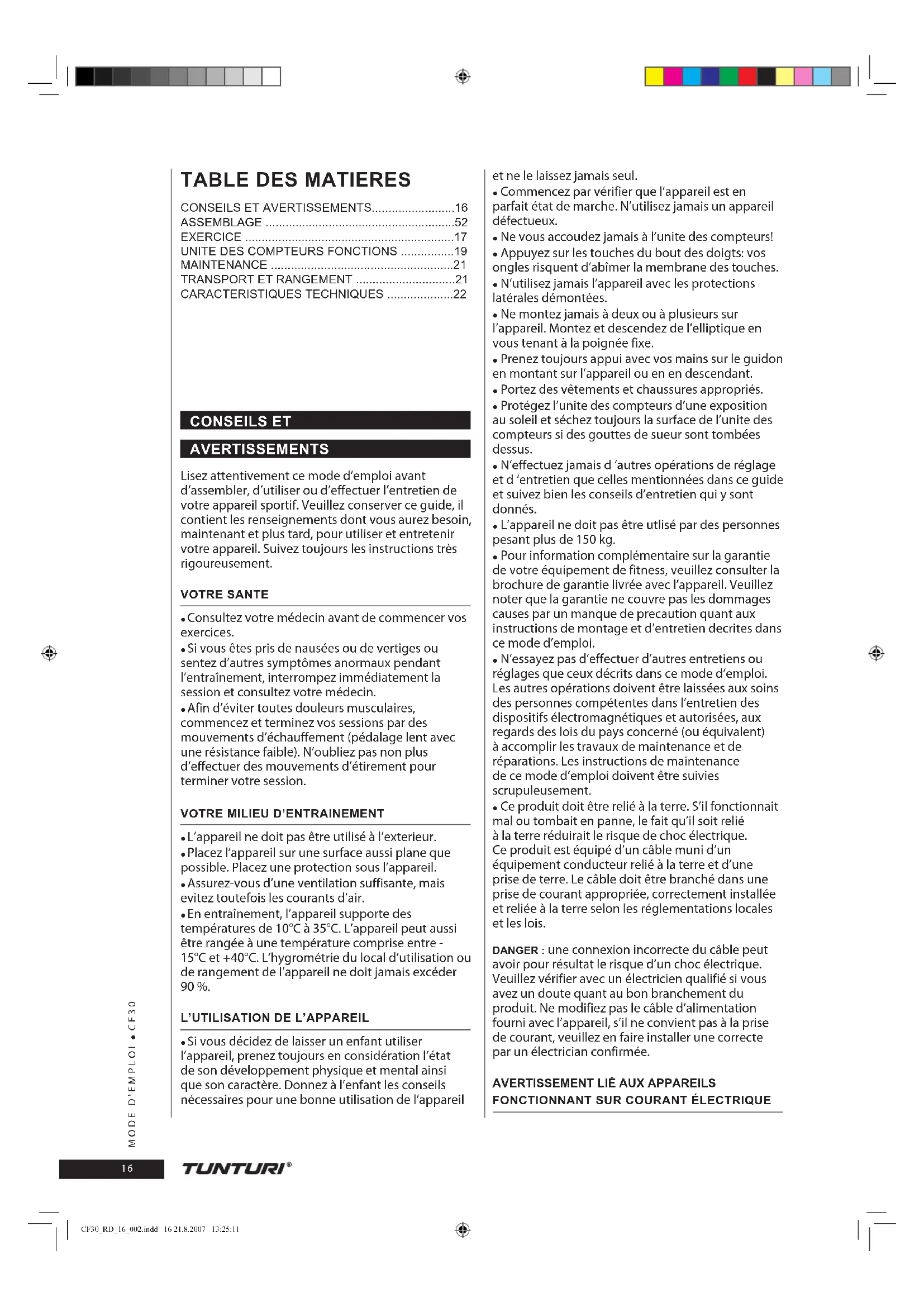 - cm Poids kg LCF30 est conforme aux normes des directives EMC de l’UE concernant la compatibilité électromagnétique (89/336/CEE) et les appareils électriques destinés à une utilisation dans certaines limites de tensions (73/23/CEE). Ce produit porte, en conséquence, la marque CE. CF30 est conforme à la norme EN-957 pour les appareils d’entraînement fixes de fitness et c’est un équipement de classe de précision A. La précision de la mesure de puissance est contrôlée lors de la fabrication en réglant le frein de l’appareil à l’aide d’un dynamomètre. Le calcul de la puissance d’exercice est basé sur la vitesse de tour et le moment. Du fait de sa politique de développement continu des produits, Tunturi se réserve le droit de modifier les spécifications sans préavis. ATTENTION ! La garantie ne couvre pas les dommages dus à une négligence des instructions d’assemblage, de réglages ou de maintenance données dans ce mode d’emploi. Suivez les instructions scrupuleusement pour l’assemblage, l’utilisation et la maintenance de votre équipement. Des changements ou modifications non expressément approuvés par Tunturi Oy Ltd rendront nulle l’autorité de l’utilisateur sur l’equipement. NOUS VOUS SOUHAITONS D’AG R é ABLES ET NOMBREUSES SéANCES D’EXE RCICE AV EC VOTRE N O U VEAU pARTENAI R E D’ENTRAÎNEMENT TUNTURI ! CF30_RD_16_002.indd 22 21.8.2007 13:25:1423 p. 58