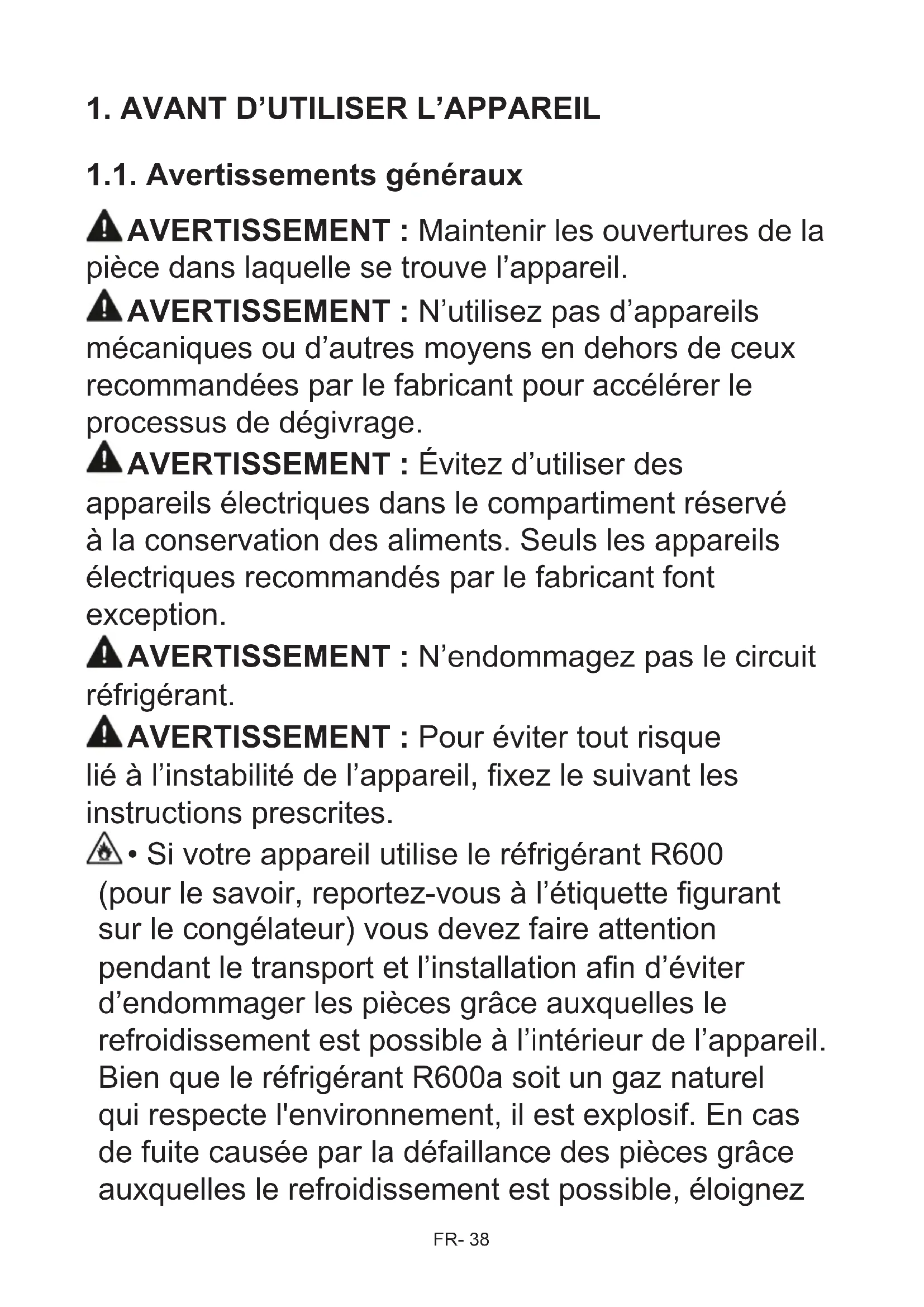1.1. Avertissements généraux ............................................................................................38 1.2. Installation et utilisation de votre réfrigérateur .............................................................41 1.3. Avertissements en matière de sécurité ........................................................................42