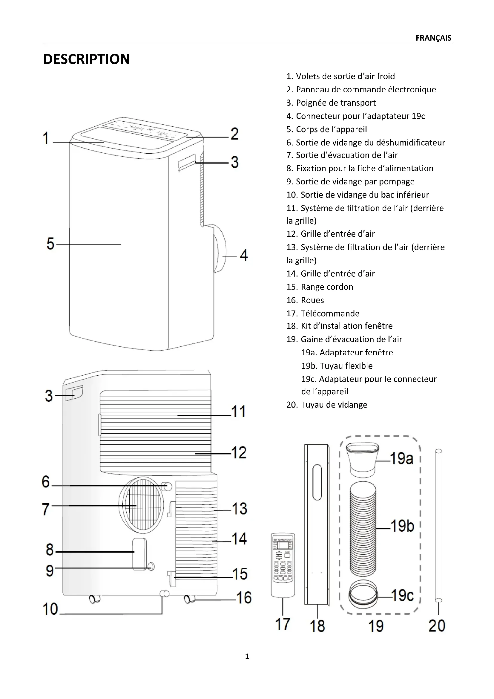 19a. Adaptateur fenêtre 19b. Tuyau flexible 19c. Adaptateur pour le connecteur de l’appareil