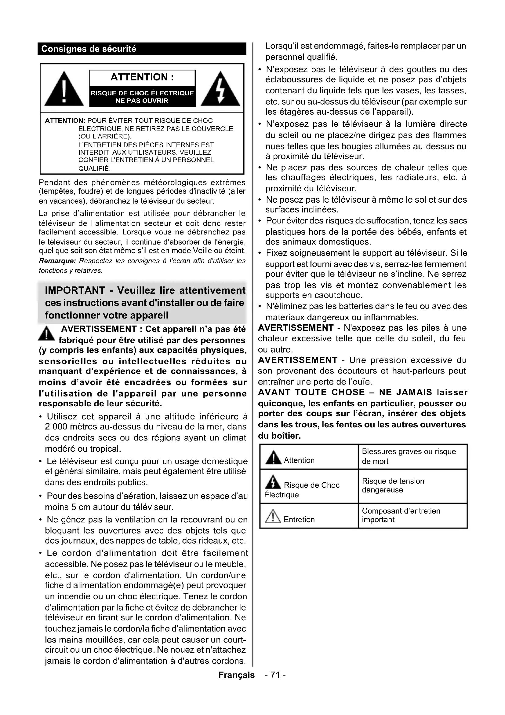 Mise en garde, voir instructions d'utilisation : Les zones marquées contiennent des piles en forme de bouton ou de pièce de monnaie remplaçables par l'utilisateur. CLASS 1 LASER PRODUCT Produit Laser de Classe 1 : Ce produit est équipé d’une source laser de Classe 1 sans danger dans des conditions d’utilisation raisonnablement prévisibles. AVERTISSEMENT N'avalez pas la pile. Les produits chimiques y contenus pourraient vous brûler. Ce produit ou les accessoires fournis avec celui-ci pourraient contenir une pile bouton. L'ingestion d'une pile bouton peut causer non seulement de sévères brûlures internes en seulement 2 heures, mais aussi le décès. Gardez les nouvelles et anciennes piles hors de portée des enfants. Si le compartiment à piles ne se ferme pas correctement, arrêtez d'utiliser le produit et tenez-le hors de la portée des enfants. Si vous pensez que des piles ont été avalées ou logées n’importe où à l’intérieur du corps, consultez de toute urgence un médecin. – – – – – – – – – – – – Ne posez jamais un téléviseur sur un support instable ou incliné. Le téléviseur pourrait chuter, et provoquer de graves blessures corporelles, voire la mort. Vous pouvez éviter de nombreuses blessures, notamment aux enfants, en prenant des précautions simples telles que :