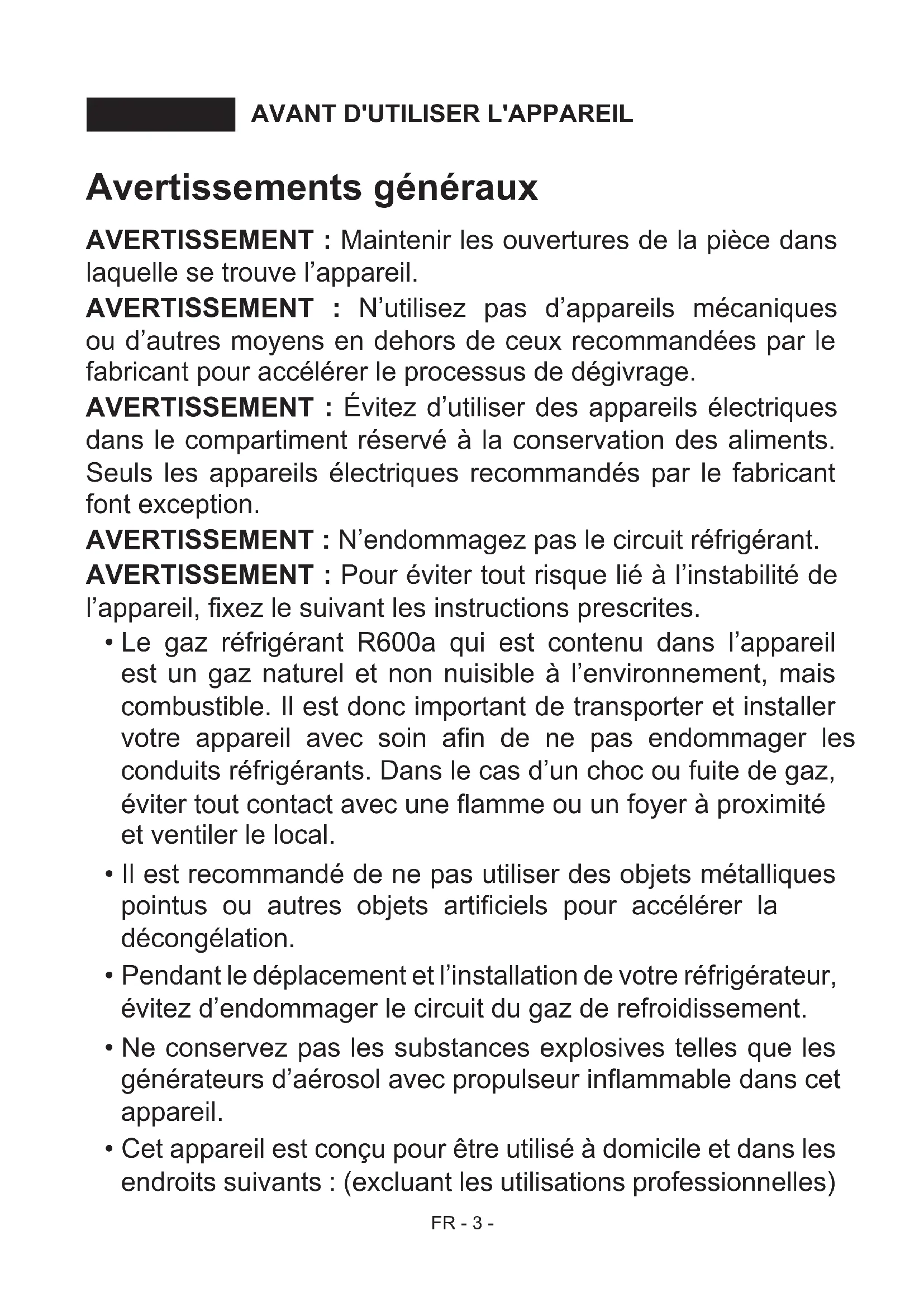 - Le gaz réfrigérant R600a qui est contenu dans l’appareil est un gaz naturel et non nuisible à l’environnement, mais combustible. Il est donc important de transporter et installer votre appareil avec soin an de ne pas endommager les conduits réfrigérants. Dans le cas d’un choc ou fuite de gaz, éviter tout contact avec une amme ou un foyer à proximité et ventiler le local.
