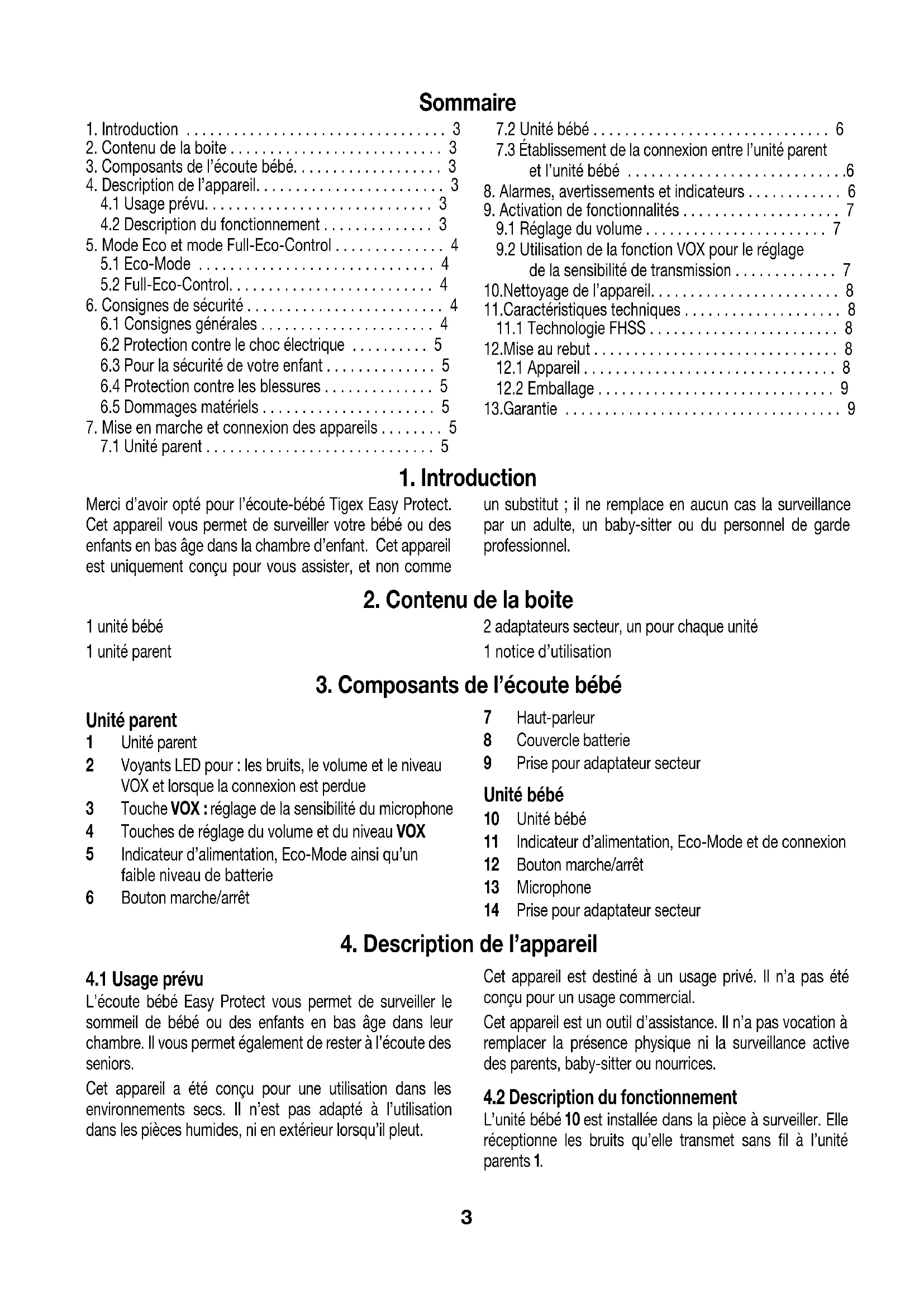Merci d’avoir opté pour l’écoute-bébé Tigex Easy Protect. Cet appareil vous permet de surveiller votre bébé ou des enfants en bas âge dans la chambre d’enfant. Cet appareil est uniquement conçu pour vous assister, et non comme un substitut ; il ne remplace en aucun cas la surveillance par un adulte, un baby-sitter ou du personnel de garde professionnel.