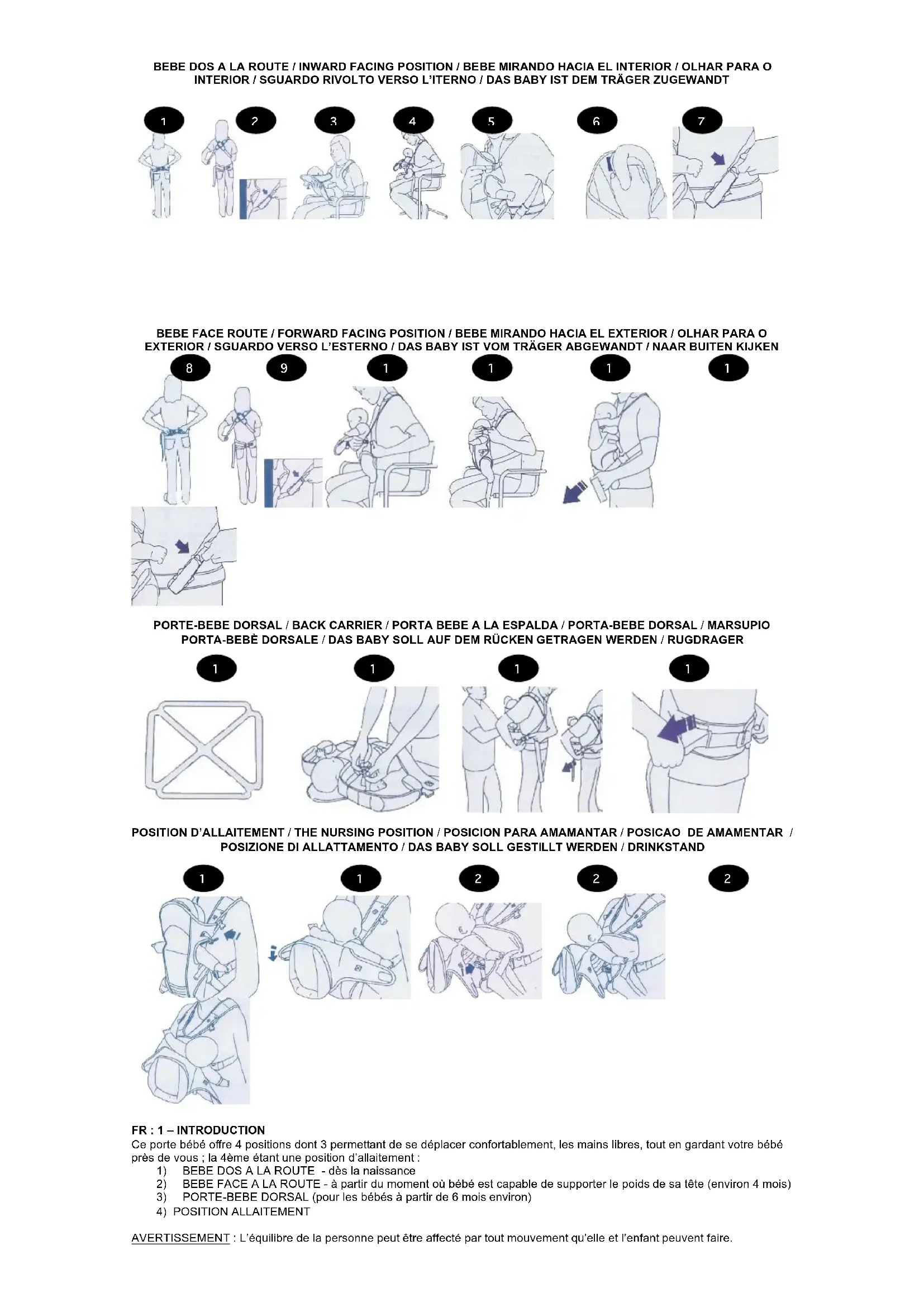 FR : 1 – INTRODUCTION Ce porte bébé offre 4 positions dont 3 permettant de se déplacer confortablement, les mains libres, tout en gardant votre bébé près de vous ; la 4ème étant une position d’allaitement :