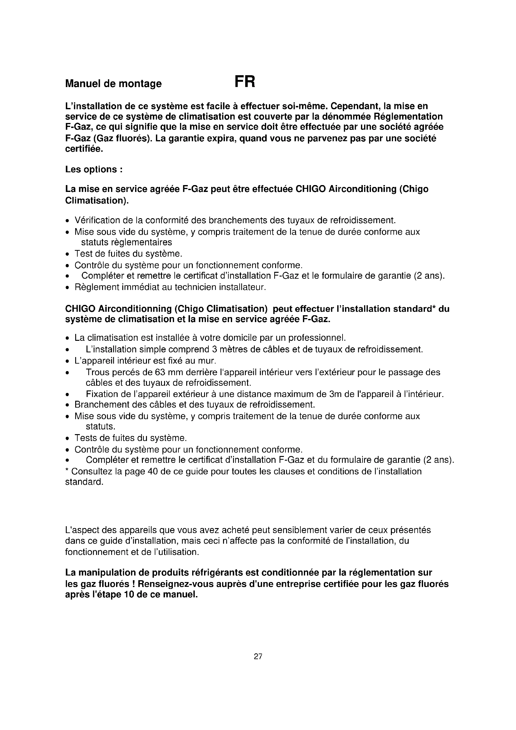 - Règlement immédiat au technicien installateur. CHIGO Airconditionning (Chigo Climatisation) peut effectuer l’installation standard* du système de climatisation et la mise en service agréée F-Gaz.