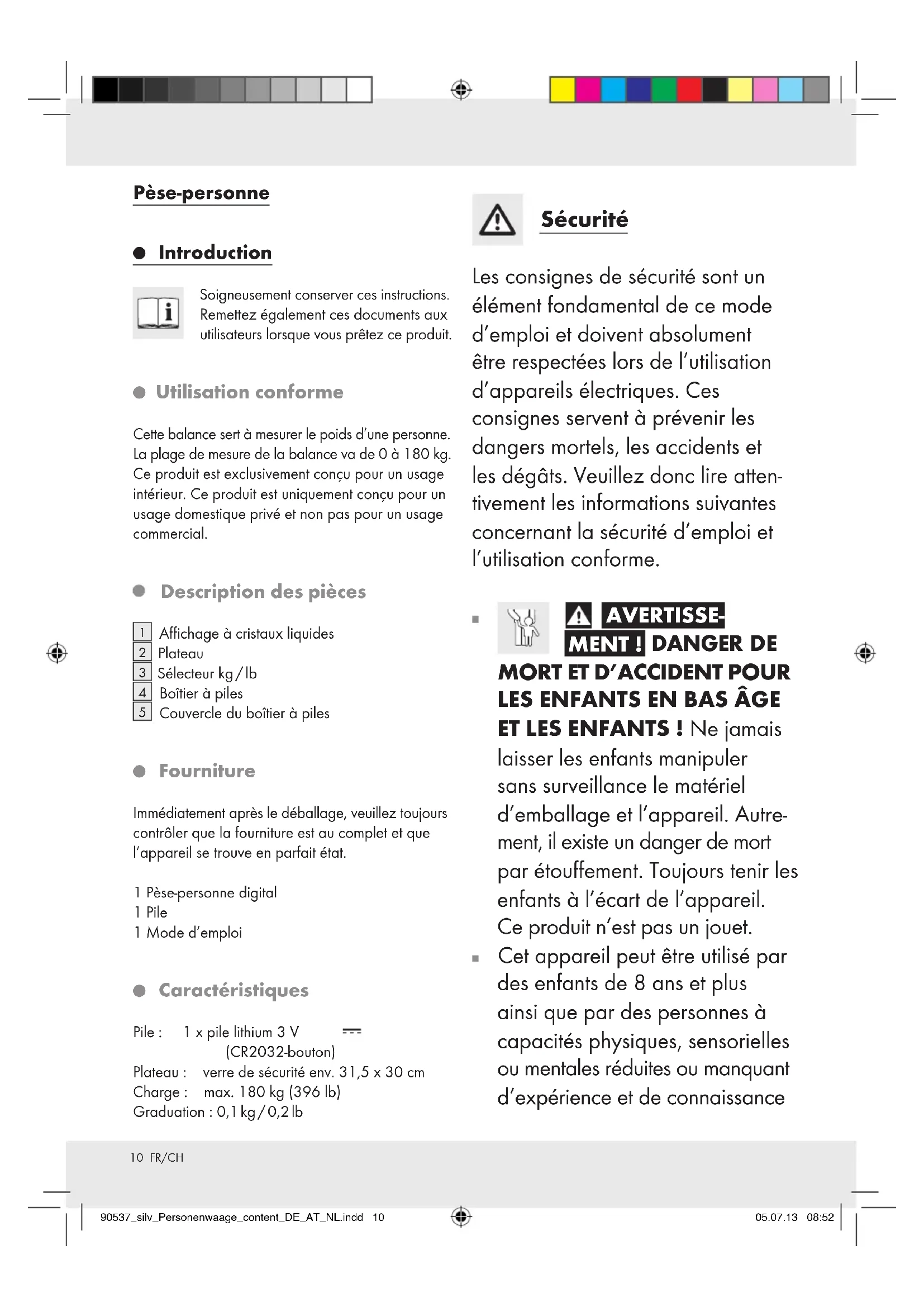 DANGER DE MORT ! Les piles ne sont pas des jouets. Ne pas laisser traîner les piles. Celles-ci peuvent être avalées par des enfants ou des animaux domestiques. Dans un tel cas, vous devez immédiatement consulter un médecin. 90537_silv_Personenwaage_content_DE_AT_NL.indd 11 05.07.13 08:5212 FR/CH