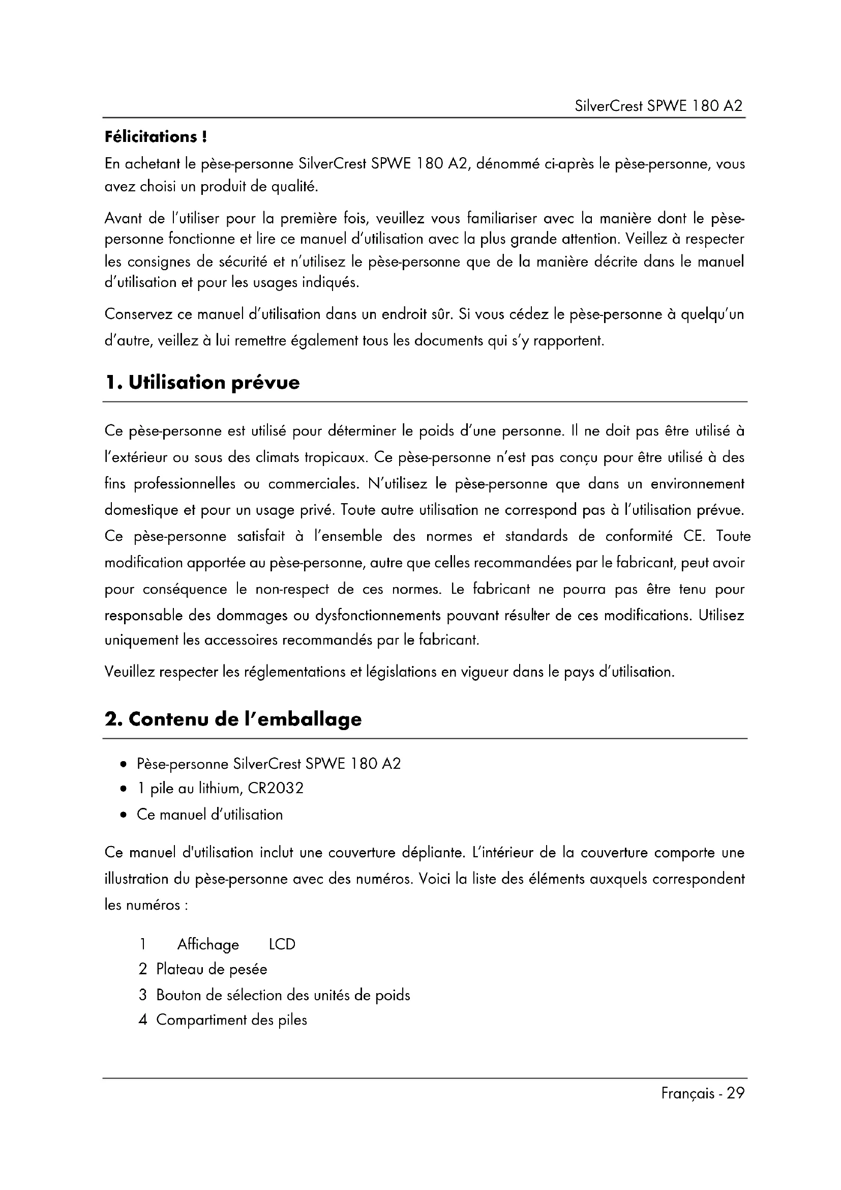 - Ce manuel d’utilisation Ce manuel d'utilisation inclut une couverture dépliante. L’intérieur de la couverture comporte une illustration du pèse-personne avec des numéros. Voici la liste des éléments auxquels correspondent les numéros : 1 Affichage LCD 2 Plateau de pesée 3 Bouton de sélection des unités de poids 4 Compartiment des pilesSilverCrest SPWE 180 A2