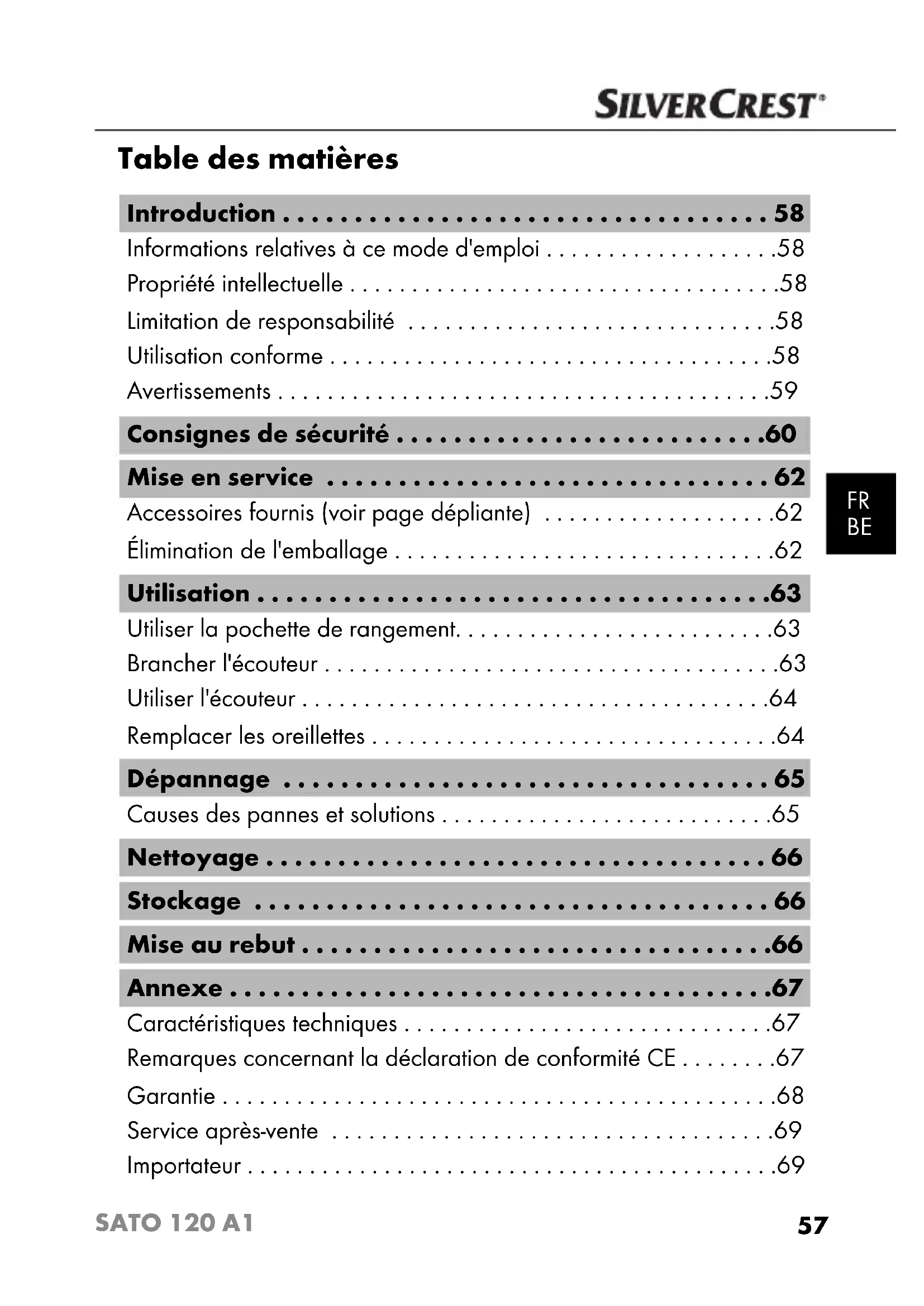 SATO 120 A1 Introduction Informations relatives à ce mode d'emploi Toutes nos félicitations pour l'achat de votre nouvel appareil. Ainsi, vous venez d'opter pour un produit de grande qualité. Le mode d'emploi fait partie de ce produit. Il contient des remarques importantes concernant la sécurité, l'usage et la mise au rebut. Avant l'usage, veuillez vous familiariser avec toutes les consignes d'opération et de sécurité. N'utilisez le produit que conformément aux consignes et pour les domaines d'utilisation prévus. Conservez soigneusement ces instructions. Si vous cédez le produit à un tiers, remettez-lui également ces instructions d'utilisation. Propriété intellectuelle Cette documentation est protégée par des droits d'auteur. Toute reproduction ou réimpression, même partielle, y compris la repro- duction des illustrations, même modifi ées, n'est autorisée qu'avec l'accord écrit du fabricant. Limitation de responsabilité Le fabricant n'assume aucune responsabilité pour les dommages résul- tant du non-respect du mode d'emploi, d'un usage non conforme, de réparations inadéquates, de modifi cations faites sans autorisation ou de l'usage de pièces de rechange non agréées. Utilisation conforme Cet écouteur est uniquement destiné à une utilisation non profession- nelle en vue de l'écoute de matériau audio. Tout usage autre ou allant au-delà n'est pas considéré conforme et peut entraîner des dommages. Aucune réclamation pour des dommages résultant d'un usage non conforme ne sera prise en considération. IB_42782_SATO120A1_LB3.indb 58IB_42782_SATO120A1_LB3.indb 58 09.10.13 11:1709.10.13 11:1759 SATO 120 A1