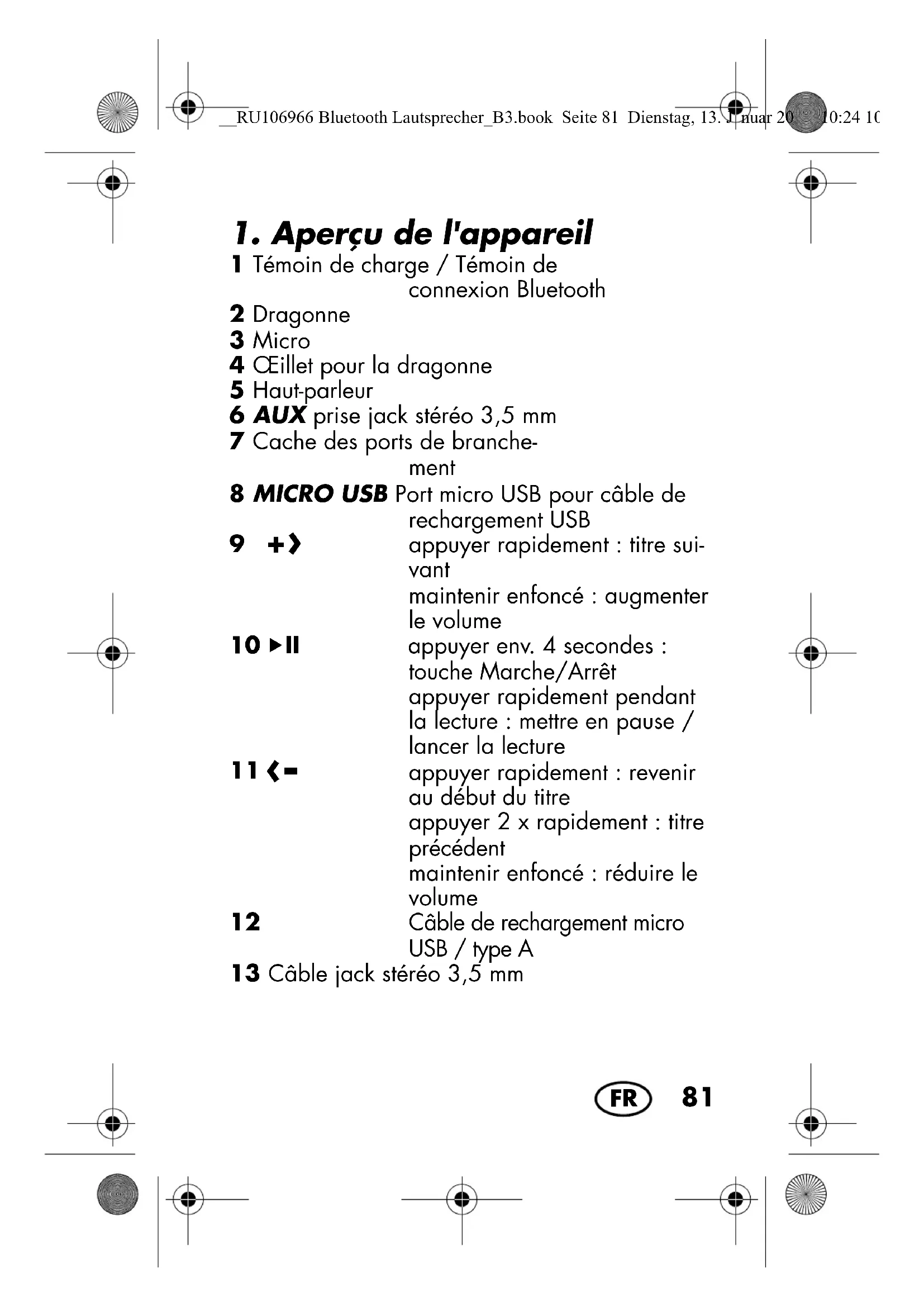 1 Haut-parleur Bluetooth d'extérieur 1 Câble de rechargement USB (type A pour port micro USB)12 1 Câble jack stéréo 3,5 mm13 1 Dragonne2 1 Mode d’emploi