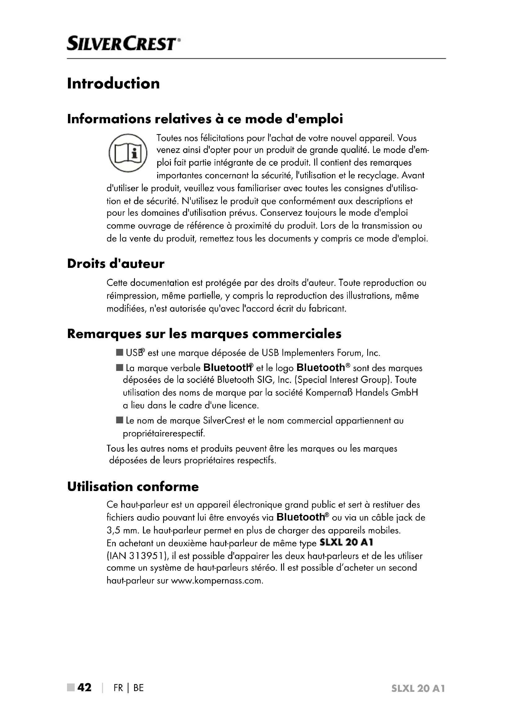 SLXL 20 A1 Introduction Informations relatives à ce mode d'emploi Toutes nos félicitations pour l'achat de votre nouvel appareil. Vous venez ainsi d'opter pour un produit de grande qualité. Le mode d'em- ploi fait partie intégrante de ce produit. Il contient des remarques importantes concernant la sécurité, l'utilisation et le recyclage. Avant d'utiliser le produit, veuillez vous familiariser avec toutes les consignes d'utilisa- tion et de sécurité. N'utilisez le produit que conformément aux descriptions et pour les domaines d'utilisation prévus. Conservez toujours le mode d'emploi comme ouvrage de référence à proximité du produit. Lors de la transmission ou de la vente du produit, remettez tous les documents y compris ce mode d'emploi. Droits d'auteur Cette documentation est protégée par des droits d'auteur. Toute reproduction ou réimpression, même partielle, y compris la reproduction des illustrations, même modifiées, n'est autorisée qu'avec l'accord écrit du fabricant. Remarques sur les marques commerciales ■ USB