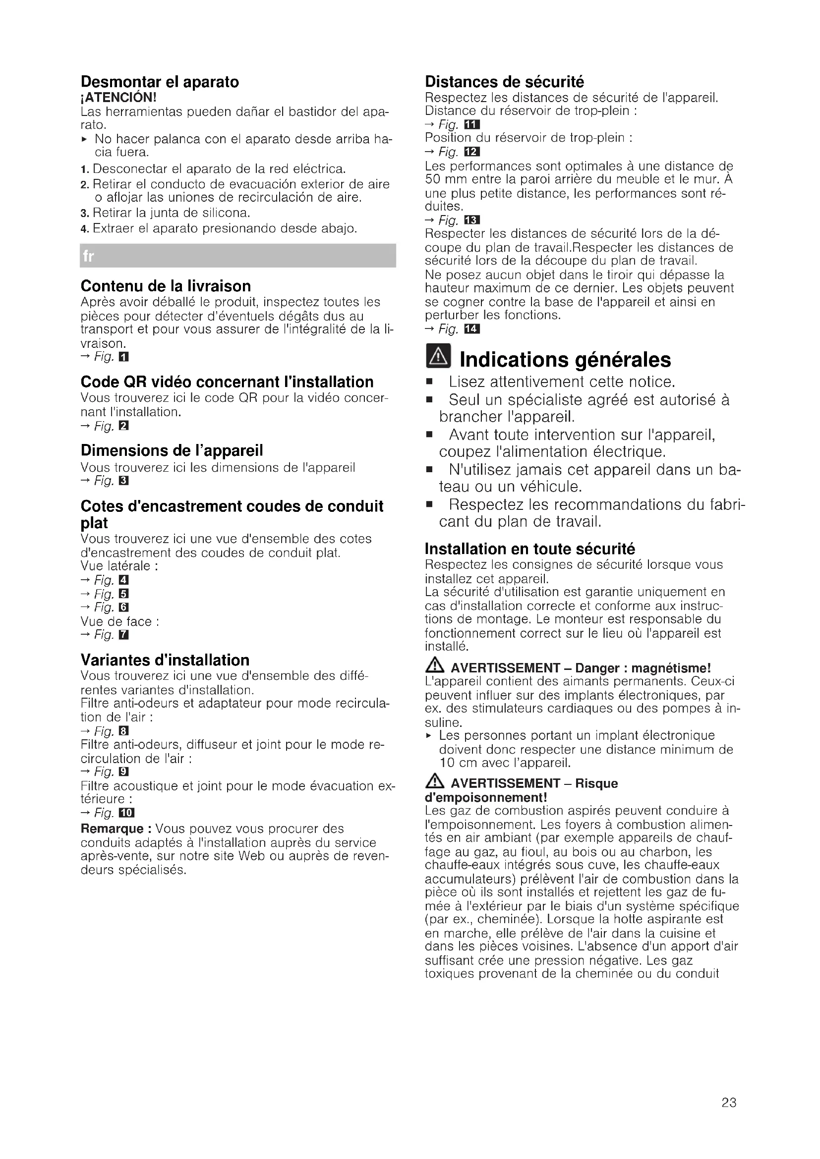 Indications générales ¡ Lisez attentivement cette notice. ¡ Seul un spécialiste agréé est autorisé à brancher l'appareil. ¡ Avant toute intervention sur l'appareil, coupez l'alimentation électrique. ¡ N'utilisez jamais cet appareil dans un ba- teau ou un véhicule. ¡ Respectez les recommandations du fabri- cant du plan de travail. Installation en toute sécurité Respectez les consignes de sécurité lorsque vous installez cet appareil. La sécurité d'utilisation est garantie uniquement en cas d'installation correcte et conforme aux instruc- tions de montage. Le monteur est responsable du fonctionnement correct sur le lieu où l'appareil est installé. AVERTISSEMENT‒Danger: magnétisme! L'appareil contient des aimants permanents. Ceux-ci peuvent influer sur des implants électroniques, par ex. des stimulateurs cardiaques ou des pompes à in- suline.