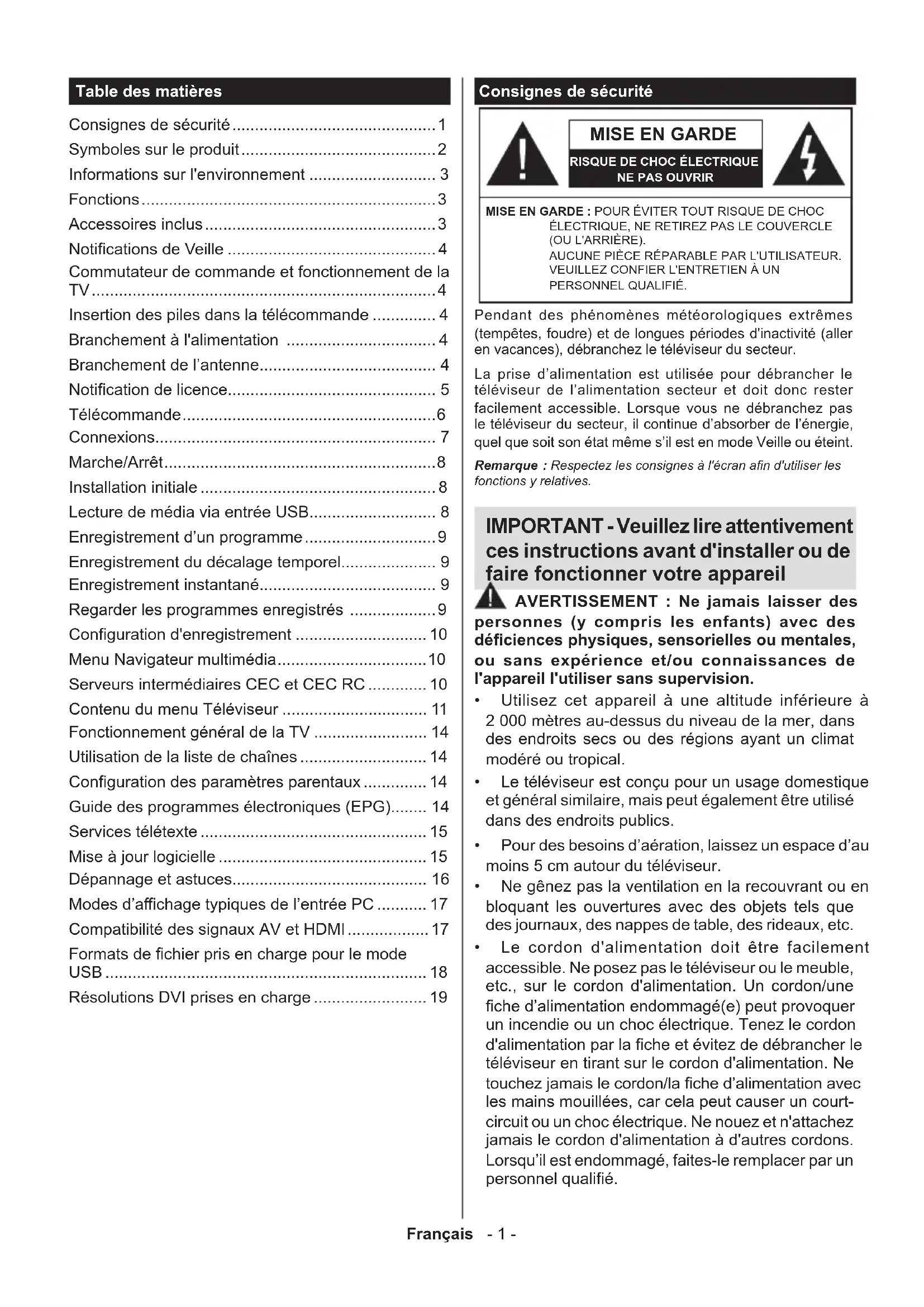 - Le cordon d'alimentation doit être facilement accessible. Ne posez pas le téléviseur ou le meuble, etc., sur le cordon d'alimentation. Un cordon/une ched’alimentationendommagé(e)peutprovoquer un incendie ou un choc électrique. Tenez le cordon d'alimentationparlacheetévitezdedébrancherle téléviseur en tirant sur le cordon d'alimentation. Ne touchezjamaislecordon/lached’alimentationavec les mains mouillées, car cela peut causer un court- circuit ou un choc électrique. Ne nouez et n'attachez jamais le cordon d'alimentation à d'autres cordons. Lorsqu’il est endommagé, faites-le remplacer par un personnelqualié. Table des matières Consignes de sécurité ............................................. 1 Symboles sur le produit ........................................... 2 Informations sur l'environnement ............................ 3 Fonctions ................................................................. 3 Accessoires inclus ................................................... 3 NoticationsdeVeille .............................................. 4 Commutateur de commande et fonctionnement de la TV ............................................................................ 4 Insertion des piles dans la télécommande .............. 4 Branchement à l'alimentation ................................. 4 Branchement de l’antenne....................................... 4 Noticationdelicence.............................................. 5 Télécommande ........................................................ 6 Connexions.............................................................. 7 Marche/Arrêt ............................................................ 8 Installation initiale .................................................... 8 Lecture de média via entrée USB............................ 8 Enregistrement d’un programme ............................. 9 Enregistrement du décalage temporel..................... 9 Enregistrement instantané....................................... 9 Regarder les programmes enregistrés ................... 9 Congurationd'enregistrement ............................. 10 Menu Navigateur multimédia ................................. 10 Serveurs intermédiaires CEC et CEC RC ............. 10 Contenu du menu Téléviseur ................................ 11 Fonctionnement général de la TV ......................... 14 Utilisation de la liste de chaînes ............................ 14 Congurationdesparamètresparentaux .............. 14 Guide des programmes électroniques (EPG)........ 14 Services télétexte .................................................. 15 Mise à jour logicielle .............................................. 15 Dépannage et astuces........................................... 16 Modesd’achagetypiquesdel’entréePC ........... 17 Compatibilité des signaux AV et HDMI .................. 17 Formatsdechierprisenchargepourlemode USB ....................................................................... 18 Résolutions DVI prises en charge ......................... 19Français - 2 -