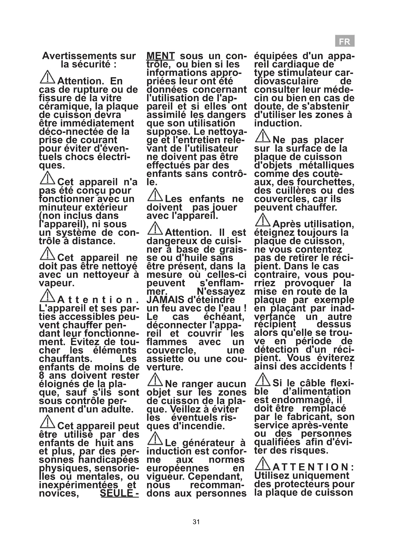 Abb. 4 Eingefahrene Klinge Ausgefahrene Klinge Gebrauch des Schabers 30FR Avertissements sur la sécurité : Attention. En cas de rupture ou de fissure de la vitre céramique, la plaque de cuisson devra être immédiatement déco-nnectée de la prise de courant pour éviter d'éven- tuels chocs électri- ques. Cet appareil n'a pas été conçu pour fonctionner avec un minuteur extérieur (non inclus dans l'appareil), ni sous un système de con- trôle à distance. Cet appareil ne doit pas être nettoyé avec un nettoyeur à vapeur. A t t e n t i o n . L'appareil et ses par- ties accessibles peu- vent chauffer pen- dant leur fonctionne- ment. Évitez de tou- cher les éléments chauffants. Les enfants de moins de 8 ans doivent rester éloignés de la pla- que, sauf s'ils sont sous contrôle per- manent d'un adulte. Cet appareil peut être utilisé par des enfants de huit ans et plus, par des per- sonnes handicapées physiques, sensorie- lles ou mentales, ou inexpérimentées et novices, SEULE