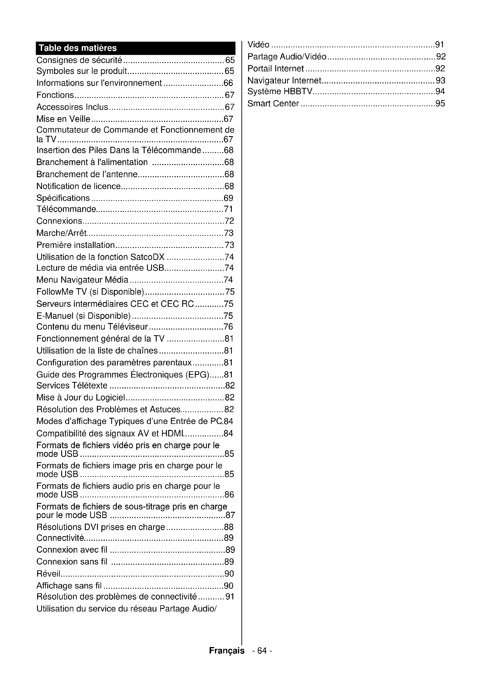 MPEG1/2 Layer3 8 Kbps ~ 320 Kbps 16KHz ~ 48KHz AAC, HEAAC 8KHz ~ 48KHz .ac3 AC3 32 Kbps ~ 640 Kbps 32KHz, 44,1KHz, 48KHz AAC, HEAAC 8KHz ~ 48KHz .swf MPEG1/2 Layer3 8 Kbps ~ 320 Kbps 16KHz ~ 48KHz .ec3 EAC3 32 Kbps ~ 6 Mbps 32KHz, 44,1KHz, 48KHz .rm, .rmvb, .ra AAC, HEAAC 8KHz ~ 48KHz LBR (cook) 6 Kbps ~ 128 Kbps 8KHz, 11,025KHz, 22,05KHz, 44,1KHz .wma, .wmv WMA 128 bps ~ 320 Kbps 8KHz ~ 48KHz WMA 10 Pro M0 < 192 kbps 48KHz WMA 10 Pro M1 < 384 kbps 48KHz WMA 10 Pro M2 < 768 kbps 96KHz .webm VORBIS Jusqu'à 48 KHz Formats de chiers de sous-titrage pris en charge pour le mode USB Sous-titrages internes Extension Support Code de sous-titrage dat, mpg, mpeg, vob MPG, MPEG Sous-titrage DVD ts, trp, tp TS Sous-titrage DVB mp4 MP4 Sous-titrage DVD UTF-8 Texte complet mkv MKV ASS SSA UTF-8 Texte complet VobSub DVD Sous-titrage DVD Sous-titres externes Extension Analyseur de sous-titre Remarque .srt Subrip .ssa/ .ass Sous-station Alpha .smi SAMI .sub SubViewer MicroDVD Système de sous-titrage DVD SubIdx (VobSub) SubViewer 1.0 & 2.0 Exclusivement .txt TMPlayerFrançais - 88 - Résolutions DVI prises en charge Reportez-vous aux résolutions suivantes au moment de raccorder des périphériques à votre téléviseur à l’aide des câbles convertisseurs DVI (DVI à HDMI - non fournis). 56Hz 60Hz 66Hz 70Hz 72Hz 75Hz 640 x 400
