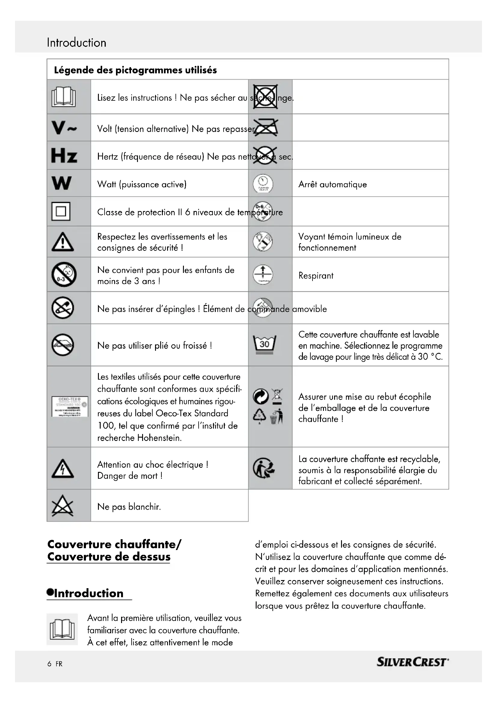 1 25 FR Table des matières Légende des pictogrammes utilisés .......................................................................... Page 6 Introduction ................................................................................................................................... Page 6 Utilisation conforme ............................................................................................................................Page 7 Descriptif des pièces ...........................................................................................................................Page 7 Contenu de la livraison .......................................................................................................................Page 7 Caractéristiques techniques ................................................................................................................Page 7 Instructions de sécurité importantes ........................................................................Page 7 Système de sécurité ...............................................................................................................Page 10 Caractéristiques particulières ........................................................................................Page 10 Mise en service ...........................................................................................................................Page 10 Activation / désactivation / sélection de la température ................................................................... Page 10 Niveaux de température ....................................................................................................................Page 11 Arrêt automatique ...............................................................................................................................Page 11 Nettoyage et entretien ........................................................................................................ Page 11 Rangement.....................................................................................................................................Page 12 Mise au rebut ............................................................................................................................... Page 12 Garantie / Service .....................................................................................................................Page 12 Déclaration de conformité ................................................................................................ Page 146 FR Introduction / Instructions de sécurité importantesIntroduction Couverture chauffante/ Couverture de dessus Introduction Avant la première utilisation, veuillez vous familiariser avec la couverture chauffante. À cet effet, lisez attentivement le mode d’emploi ci-dessous et les consignes de sécurité. N‘utilisez la couverture chauffante que comme dé- crit et pour les domaines d‘application mentionnés. Veuillez conserver soigneusement ces instructions. Remettez également ces documents aux utilisateurs lorsque vous prêtez la couverture chauffante. Légende des pictogrammes utilisés Lisez les instructions ! Ne pas sécher au sèche-linge. Volt (tension alternative) Ne pas repasser. Hertz (fréquence de réseau) Ne pas nettoyer à sec. Watt (puissance active) Automatic shut-off Arrêt automatique Classe de protection II 6 niveaux de température Respectez les avertissements et les consignes de sécurité ! Voyant témoin lumineux de fonctionnement Ne convient pas pour les enfants de moins de 3 ans ! Breathable Respirant Ne pas insérer d’épingles ! Élément de commande amovible Ne pas utiliser plié ou froissé! Cette couverture chauffante est lavable en machine. Sélectionnez le programme de lavage pour linge très délicat à 30 °C. Les textiles utilisés pour cette couverture chauffante sont conformes aux spécifi- cations écologiques et humaines rigou- reuses du label Oeco-Tex Standard 100, tel que confirmé par l‘institut de recherche Hohenstein.