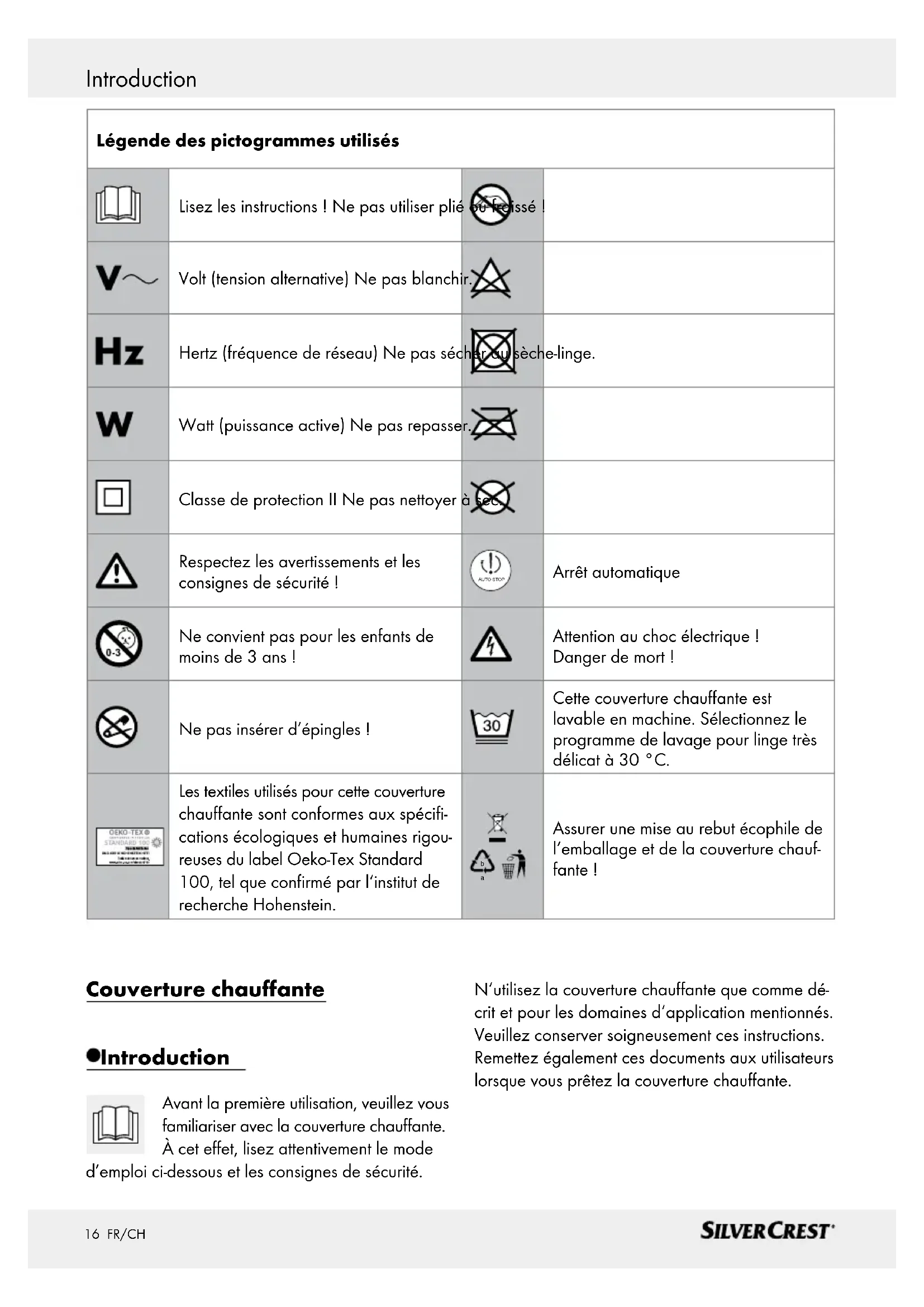 Assurer une mise au rebut écophile de l‘emballage et de la couverture chauf- fante! Couverture chauffante Introduction Avant la première utilisation, veuillez vous familiariser avec la couverture chauffante. À cet effet, lisez attentivement le mode d’emploi ci-dessous et les consignes de sécurité. N‘utilisez la couverture chauffante que comme dé- crit et pour les domaines d‘application mentionnés. Veuillez conserver soigneusement ces instructions. Remettez également ces documents aux utilisateurs lorsque vous prêtez la couverture chauffante.17 FR/CH Introduction Introduction / Instructions de sécurité importantes Utilisation conforme Cette couverture chauffante est prévue pour réchauf- fer le corps humain. Elle ne peut être utilisée que pour couvrir et non comme dessous de lit. Cette couver- ture chauffante n‘est pas destinée à être utilisée en milieu hospitalier ni pour un usage professionnel ou commercial. Ne l’utilisez pas pour réchauffer des nourrissons, des enfants en bas âge, des personnes insensibles à la chaleur ou dépendantes des autres et des animaux. Toute utilisation autre que celle dé- crite ci-dessus ou toute modification de la couverture chauffante est interdite et peut entraîner des bles- sures et / ou des dégâts sur la couverture chauf- fante. Le fabricant décline toute responsabilité en cas de dégâts issus d’une utilisation non conforme. Descriptif des pièces