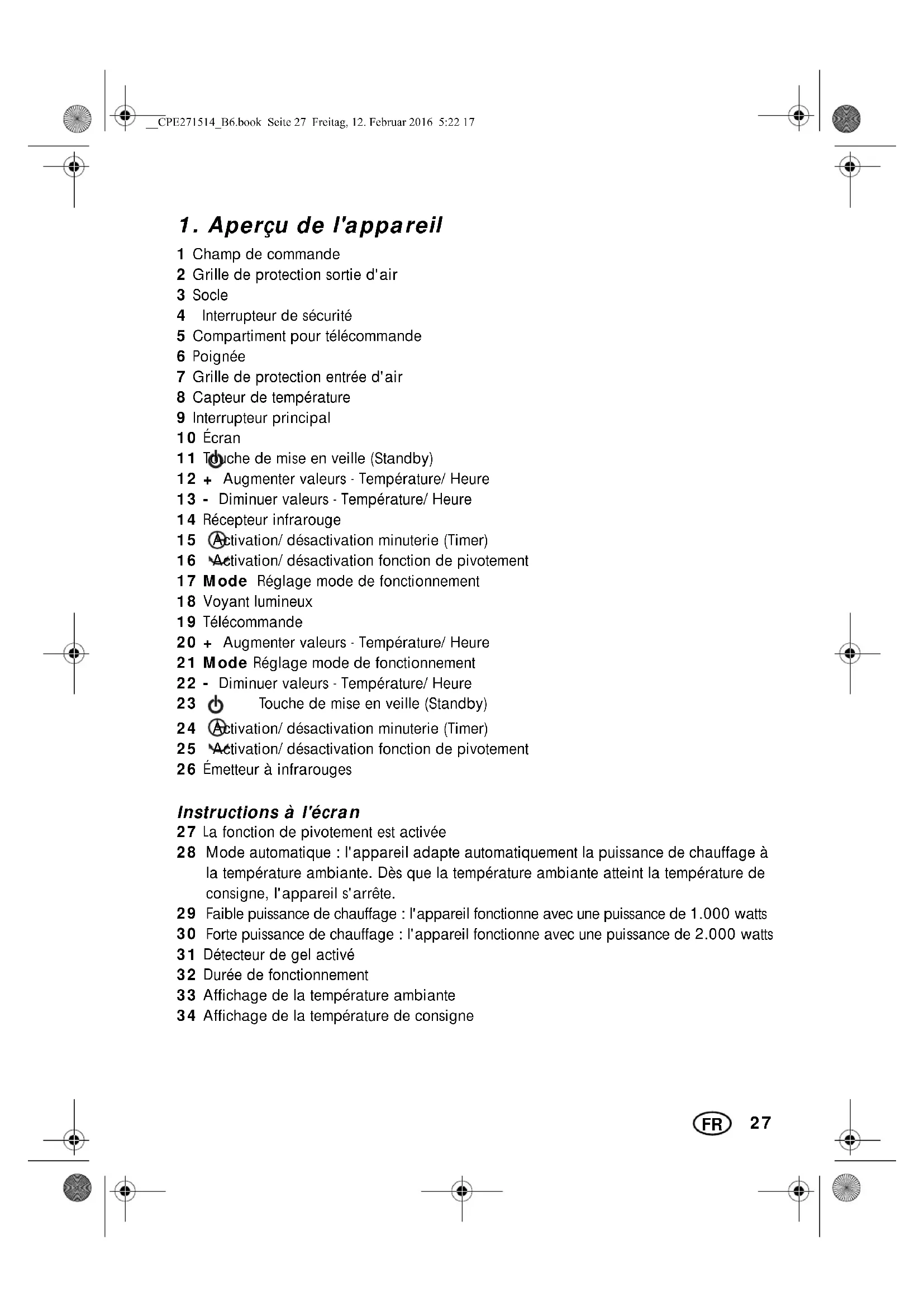 23 Touche de mise en veille (Standby) 24 Activation/désactivation minuterie (Timer) 25 Activation/désactivation fonction de pivotement 26 Émetteur à infrarouges Instructions à l'écran 27 La fonction de pivotement est activée 28 Mode automatique : l'appareil adapte automatiquement la puissance de chauffage à la température ambiante. Dès que la température ambiante atteint la température de consigne, l'appareil s'arrête.