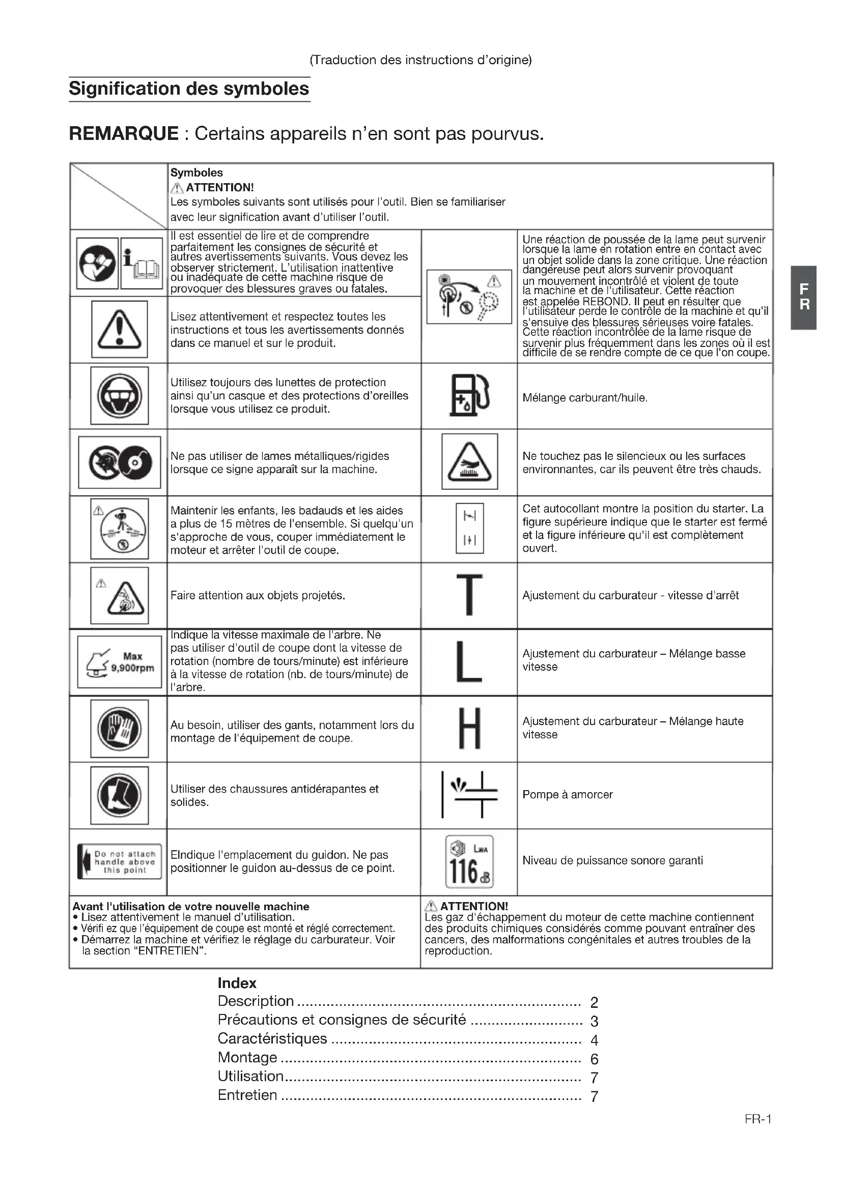 - Démarrez la machine et vérifiez le réglage du carburateur. Voir la section “ENTRETIEN”. Signification des symboles REMARQUE : Certains appareils n’en sont pas pourvus. Symboles ATTENTION! Les symboles suivants sont utilisés pour l’outil. Bien se familiariser avec leur signification avant d’utiliser l’outil. Lisez attentivement et respectez toutes les instructions et tous les avertissements donnés dans ce manuel et sur le produit. Il est essentiel de lire et de comprendre parfaitement les consignes de sécurité et autres avertissements suivants. Vous devez les observer strictement. L’utilisation inattentive ou inadéquate de cette machine risque de provoquer des blessures graves ou fatales. Utilisez toujours des lunettes de protection ainsi qu’un casque et des protections d’oreilles lorsque vous utilisez ce produit. (Traduction des instructions d’origine) ATTENTION! Les gaz d'échappement du moteur de cette machine contiennent des produits chimiques considérés comme pouvant entraîner des cancers, des malformations congénitales et autres troubles de la reproduction. Mélange carburant/huile. Ne touchez pas le silencieux ou les surfaces environnantes, car ils peuvent être très chauds. Cet autocollant montre la position du starter. La figure supérieure indique que le starter est fermé et la figure inférieure qu'il est complètement ouvert. Ajustement du carburateur - vitesse d'arrêt Ajustement du carburateur – Mélange basse vitesse Ajustement du carburateur – Mélange haute vitesse Pompe à amorcer Niveau de puissance sonore garantiFR-2
