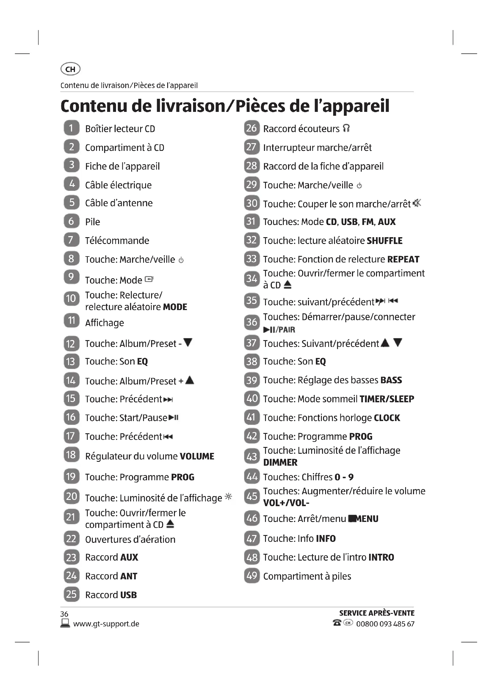Classe laser: 1 Radio FM: 87,5 – 108MHz Formats audio supportés: CD audio, MP3 Possibilités de raccordement: USB 2.0 (max. 64 GB - FAT32), AUX IN (2 × Cinch), Bluetooth® (3.0 + A2DP), raccord d’antenne (75 Ohm), écouteurs (fiche jack 3,5 mm) Poids: env. 3 kg Dimensions (L x P x H): 366 × 220 × 111 mm Portée télécommande: env. 6 m No d’article: 46118 Comme nos produits sont constamment en développement et en amélioration, des modifications techniques et de design peuvent survenir. Déclaration de conformité La conformité du produit aux standards prescrits par la loi est garantie. Vous pouvez trouver la déclaration de conformité complète sur Internet www.gt-support.de.Élimination