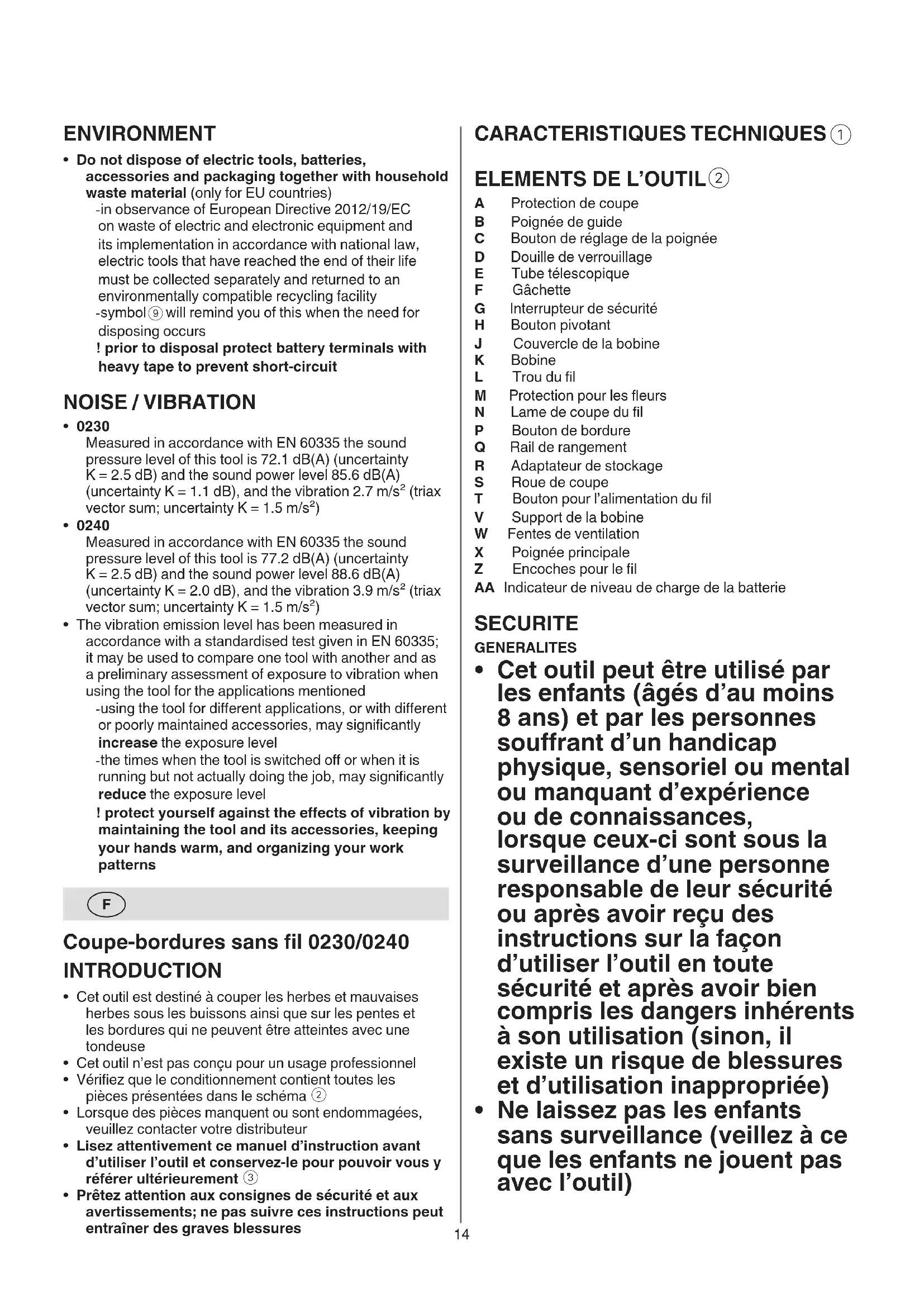 A Protection de coupe B Poignée de guide C Bouton de réglage de la poignée D Douille de verrouillage E Tube télescopique F Gâchette G Interrupteur de sécurité H Bouton pivotant J Couvercle de la bobine K Bobine L Trou du l M Protection pour les eurs N Lame de coupe du l P Bouton de bordure Q Rail de rangement R Adaptateur de stockage S Roue de coupe T Bouton pour l’alimentation du l V Support de la bobine W Fentes de ventilation X Poignée principale Z Encoches pour le l AA Indicateur de niveau de charge de la batterie SECURITE GENERALITES