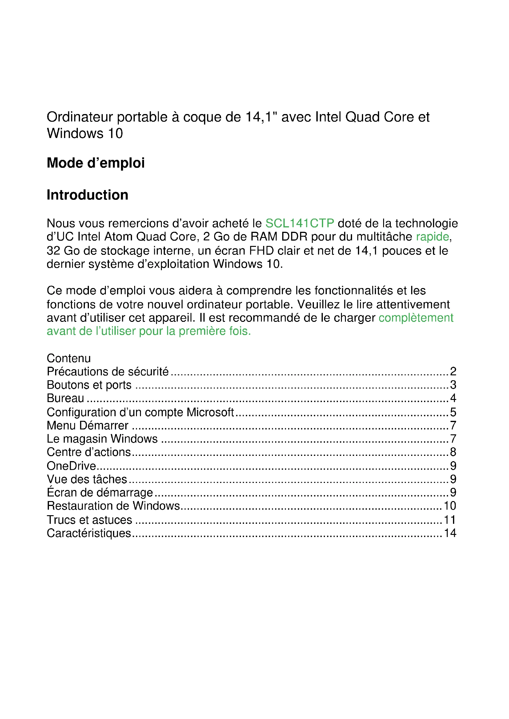 SCL141CTP Manuel d’utilisation User guideOrdinateur portable à coque de 14,1" avec Intel Quad Core et Windows 10 Mode d’emploi Introduction