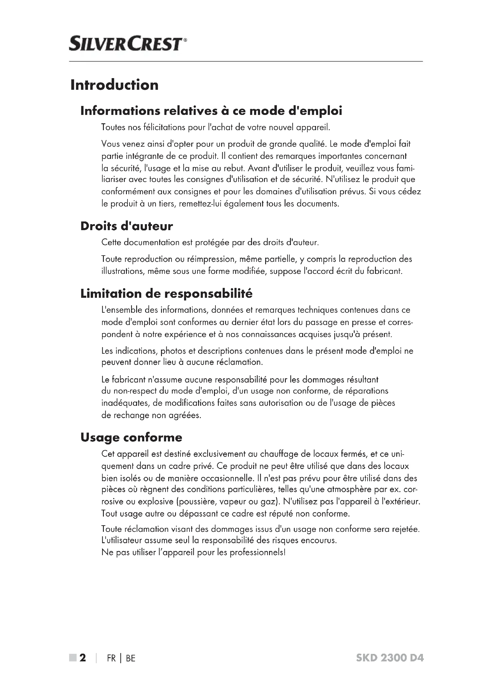 SKD 2300 D4 Introduction Informations relatives à ce mode d'emploi Toutes nos félicitations pour l'achat de votre nouvel appareil. Vous venez ainsi d'opter pour un produit de grande qualité. Le mode d'emploi fait partie intégrante de ce produit. Il contient des remarques importantes concernant la sécurité, l'usage et la mise au rebut. Avant d'utiliser le produit, veuillez vous fami- liariser avec toutes les consignes d'utilisation et de sécurité. N'utilisez le produit que conformément aux consignes et pour les domaines d'utilisation prévus. Si vous cédez le produit à un tiers, remettez-lui également tous les documents. Droits d'auteur Cette documentation est protégée par des droits d'auteur. Toute reproduction ou réimpression, même partielle, y compris la reproduction des illustrations, même sous une forme modifiée, suppose l'accord écrit du fabricant. Limitation de responsabilité L'ensemble des informations, données et remarques techniques contenues dans ce mode d'emploi sont conformes au dernier état lors du passage en presse et corres- pondent à notre expérience et à nos connaissances acquises jusqu'à présent. Les indications, photos et descriptions contenues dans le présent mode d'emploi ne peuvent donner lieu à aucune réclamation. Le fabricant n'assume aucune responsabilité pour les dommages résultant du non-respect du mode d'emploi, d'un usage non conforme, de réparations inadéquates, de modifications faites sans autorisation ou de l'usage de pièces de rechange non agréées. Usage conforme Cet appareil est destiné exclusivement au chauffage de locaux fermés, et ce uni- quement dans un cadre privé. Ce produit ne peut être utilisé que dans des locaux bien isolés ou de manière occasionnelle. Il n'est pas prévu pour être utilisé dans des pièces où règnent des conditions particulières, telles qu'une atmosphère par ex. cor- rosive ou explosive (poussière, vapeur ou gaz). N'utilisez pas l'appareil à l'extérieur. Tout usage autre ou dépassant ce cadre est réputé non conforme. Toute réclamation visant des dommages issus d'un usage non conforme sera rejetée. L'utilisateur assume seul la responsabilité des risques encourus. Ne pas utiliser l’appareil pour les professionnels!FR