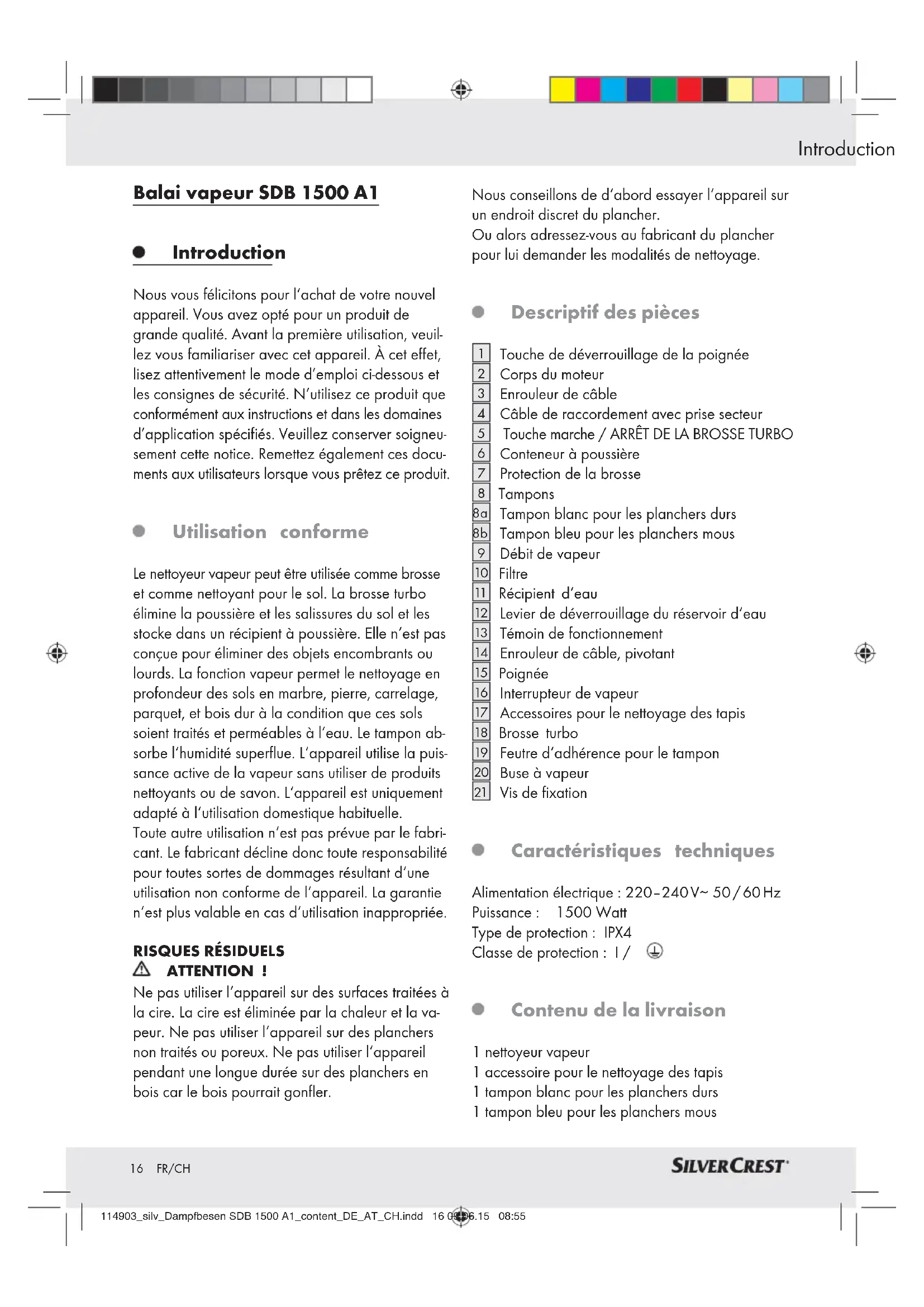 Zeitlos Service Paketfach 90 AT-4005 Linz Telefon Hotline: +49 (0) 7667 - 9069493 (DE) 00800 09348567 (CH / AT) E-Mail: service@mynetsend.de (DE / AT / CH) Hersteller- / Importeurbezeichnung: De‘Longhi Appliances S.r.l. Via L. Seitz, 47 31100 Treviso Italien Tel.: +39-0422-4131 Fax: +39-0422-413736 Produktbezeichnung: Dampfbesen SDB 1500 A1 IAN 114903 Konformitätserklärung Dieses Produkt erfüllt die Anforderungen der gelten- den europäischen und nationalen Richtlinien (Elekt- romagnetische Verträglichkeit 2004 / 108 / EC, Niederspannungsrichtlinie 2006 / 95 / EC). Die Konformität wurde nachgewiesen. Entsprechende Erklärungen und Unterlagen sind beim Hersteller hinterlegt. 114903_silv_Dampfbesen SDB 1500 A1_content_DE_AT_CH.indd 14 09.06.15 08:5515 FR/CH Table des matières Introduction Utilisation conforme ............................................................................................................................Page 16 Descriptif des pièces ...........................................................................................................................Page 16 Caractéristiques techniques ................................................................................................................Page 16 Contenu de la livraison .......................................................................................................................Page 16 Indications de sécurité .........................................................................................................Page 17 Avant la mise en service Monter le nettoyeur vapeur ................................................................................................................Page 19 Préparer le nettoyeur vapeur ..............................................................................................................Page 19 Mise en service Éteindre / allumer la brosse turbo ......................................................................................................Page 19 Utiliser la fonction vapeur ...................................................................................................................Page 19 Changer les tampons ..........................................................................................................................Page 20 Remplir le réservoir d‘eau pendant l‘utilisation .................................................................................Page 20 Utiliser l‘accessoire pour le nettoyage des tapis ...............................................................................Page 20 Mettre fin au fonctionnement .............................................................................................................Page 21 Nettoyage et maintenance Remplacer le filtre ...............................................................................................................................Page 21 Dépannage .........................................................................................................................................Page 22 Mise au rebut ...............................................................................................................................Page 23 Garantie ...........................................................................................................................................Page 23 Service après-vente ................................................................................................................ Page 24 Déclaration de conformité ................................................................................................ Page 25 114903_silv_Dampfbesen SDB 1500 A1_content_DE_AT_CH.indd 15 09.06.15 08:5516 FR/CH Introduction Balai vapeur SDB 1500 A1 Introduction Nous vous félicitons pour l‘achat de votre nouvel appareil. Vous avez opté pour un produit de grande qualité. Avant la première utilisation, veuil- lez vous familiariser avec cet appareil. À cet effet, lisez attentivement le mode d’emploi ci-dessous et les consignes de sécurité. N‘utilisez ce produit que conformément aux instructions et dans les domaines d’application spécifiés. Veuillez conserver soigneu- sement cette notice. Remettez également ces docu- ments aux utilisateurs lorsque vous prêtez ce produit. Utilisation conforme Le nettoyeur vapeur peut être utilisée comme brosse et comme nettoyant pour le sol. La brosse turbo élimine la poussière et les salissures du sol et les stocke dans un récipient à poussière. Elle n‘est pas conçue pour éliminer des objets encombrants ou lourds. La fonction vapeur permet le nettoyage en profondeur des sols en marbre, pierre, carrelage, parquet, et bois dur à la condition que ces sols soient traités et perméables à l‘eau. Le tampon ab- sorbe l‘humidité superflue. L‘appareil utilise la puis- sance active de la vapeur sans utiliser de produits nettoyants ou de savon. L‘appareil est uniquement adapté à l‘utilisation domestique habituelle. Toute autre utilisation n‘est pas prévue par le fabri- cant. Le fabricant décline donc toute responsabilité pour toutes sortes de dommages résultant d‘une utilisation non conforme de l‘appareil. La garantie n‘est plus valable en cas d‘utilisation inappropriée.