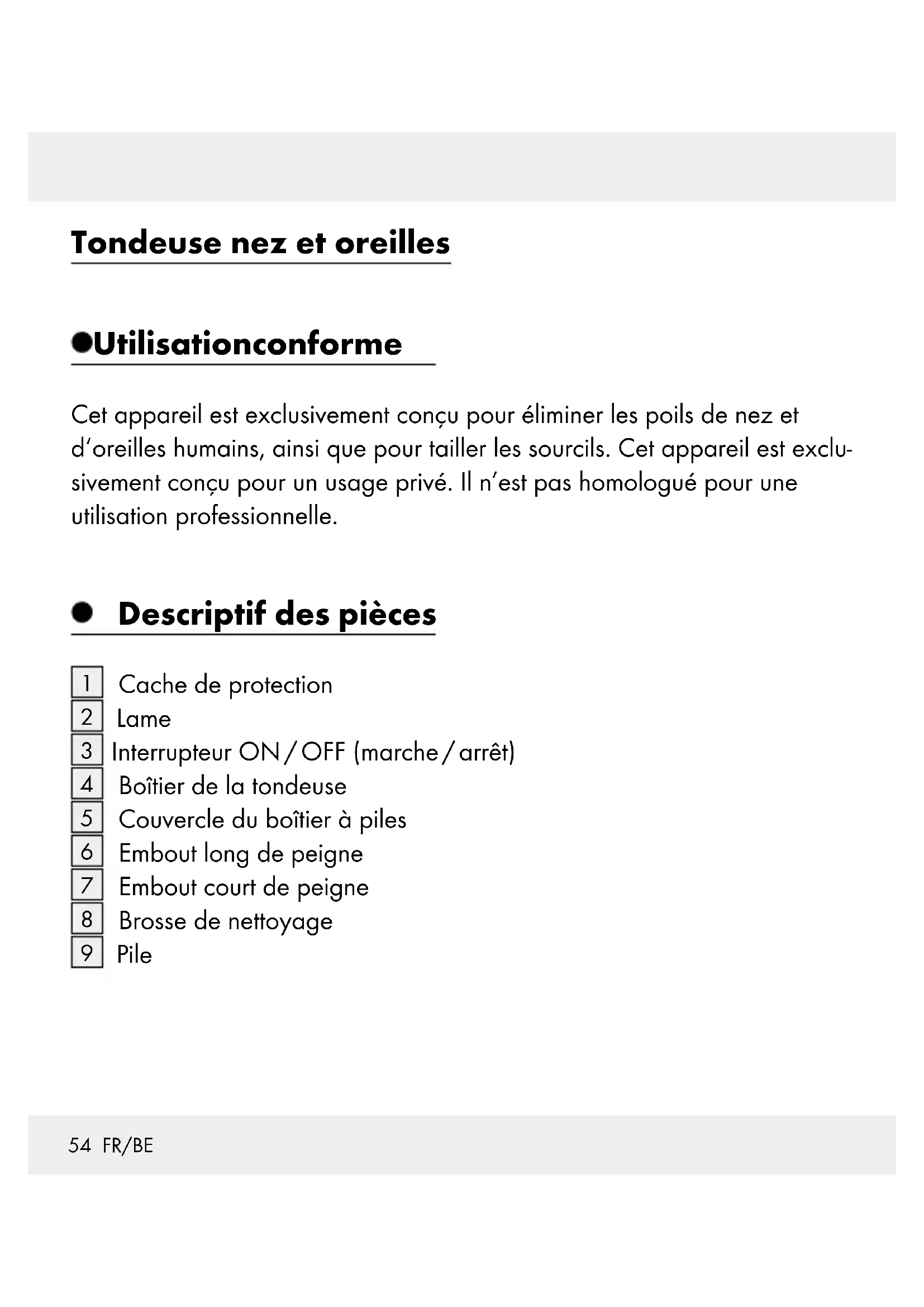 Pile55 FR/BE Caractéristiques techniques Pile : pile 1,5 V (AA) Indice de protection: IPX4 (protégé contre les projections de liquides) Niveau de pression acoustique d‘émission : < 72 dB(A), K = 3 dB(A) Contenu de la livraison 1 tondeuse nez et oreilles 1 pile 1,5 V / AA 1 brosse de nettoyage 1 embout long de peigne 1 embout court de peigne 1 notice d‘utilisation Mesures de sécurité