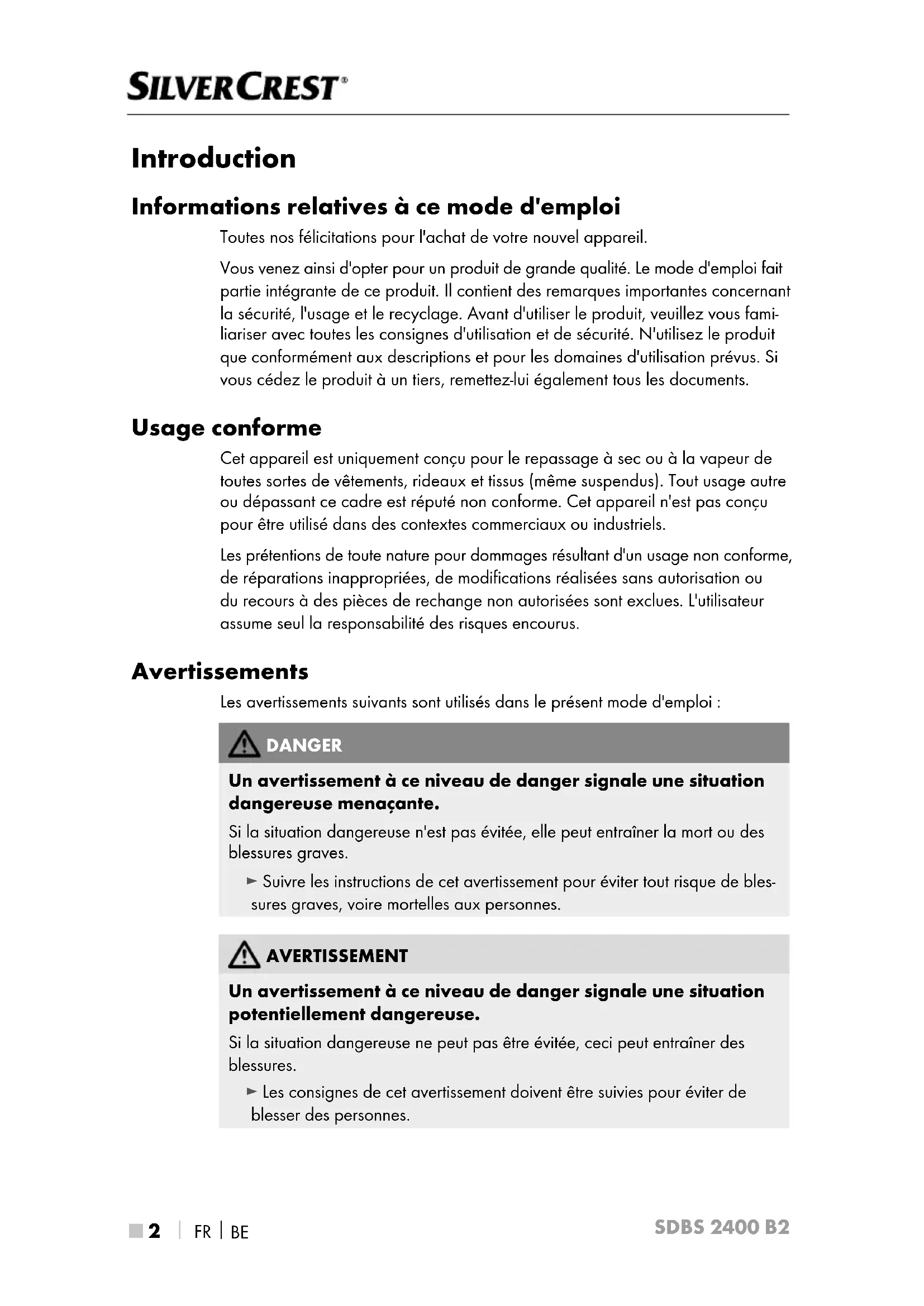 Introduction Informations relatives à ce mode d'emploi Toutes nos félicitations pour l'achat de votre nouvel appareil. Vous venez ainsi d'opter pour un produit de grande qualité. Le mode d'emploi fait partie intégrante de ce produit. Il contient des remarques importantes concernant la sécurité, l'usage et le recyclage. Avant d'utiliser le produit, veuillez vous fami- liariser avec toutes les consignes d'utilisation et de sécurité. N'utilisez le produit que conformément aux descriptions et pour les domaines d'utilisation prévus. Si vous cédez le produit à un tiers, remettez-lui également tous les documents. Usage conforme Cet appareil est uniquement conçu pour le repassage à sec ou à la vapeur de toutes sortes de vêtements, rideaux et tissus (même suspendus). Tout usage autre ou dépassant ce cadre est réputé non conforme. Cet appareil n'est pas conçu pour être utilisé dans des contextes commerciaux ou industriels. Les prétentions de toute nature pour dommages résultant d'un usage non conforme, de réparations inappropriées, de modifications réalisées sans autorisation ou du recours à des pièces de rechange non autorisées sont exclues. L'utilisateur assume seul la responsabilité des risques encourus. Avertissements Les avertissements suivants sont utilisés dans le présent mode d'emploi: DANGER Un avertissement à ce niveau de danger signale une situation dangereuse menaçante. Si la situation dangereuse n'est pas évitée, elle peut entraîner la mort ou des blessures graves. ► Suivre les instructions de cet avertissement pour éviter tout risque de bles- sures graves, voire mortelles aux personnes. AVERTISSEMENT Un avertissement à ce niveau de danger signale une situation potentiellement dangereuse. Si la situation dangereuse ne peut pas être évitée, ceci peut entraîner des blessures. ► Les consignes de cet avertissement doivent être suivies pour éviter de blesser des personnes.SDBS 2400 B2