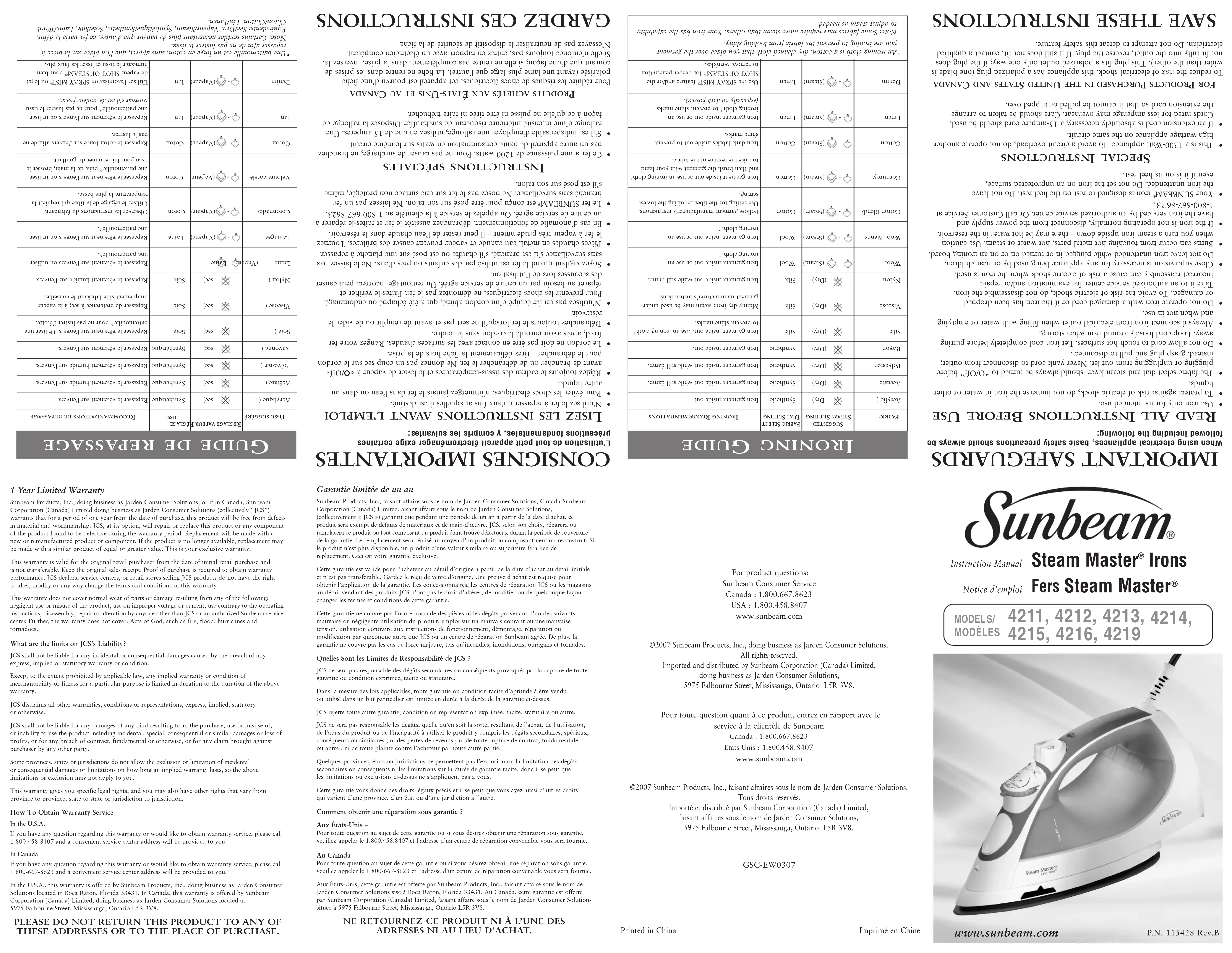 www.sunbeam.com ©2007 Sunbeam Pr oducts, Inc., faisant af faires sous le nom de Jarden Consumer Solutions. Tous droits réservés. Importé et distribué par Sunbeam Corporation (Canada) Limited, faisant affaires sous le nom de Jarden Consumer Solutions, 5975 Falbour ne Street, Mississauga, Ontario L5R 3V8. GSC-EW0307 Printed in China Imprimé en Chine Garantie limitée de un an Sunbeam Products, Inc., faisant af fair e sous le nom de Jarden ConsumerSolutions, Canada SunbeamCorporation (Canada) Limited, aisant af fair e sous le nom de Jarden Consumer Solutions, (collectivement « JCS ») garantit que pendant une période de un an à partir de la date d’achat, ce produit sera exempt de défauts de matériaux et de main-d’œuvre. JCS, selon son choix, réparera ouremplacera ce produit ou tout composant du produit étant trouvé défectueux durant la période de couverturede la garantie. Le remplacement sera réalisé au moyen d’un produit ou composant neuf ou reconstruit. Sile produit n’est plus disponible, unproduit d’une valeur similaire ou supérieure fera lieu dereplacement. Ceci est votre garantie exclusive.Cette garantie est valide pour l’acheteur au détail d’origine à partir de la date d’achat au détail initialeet n’est pas transférable. Gardez le reçu de vente d’origine. Une preuve d’achat est requise pourobtenir l’application de la garantie. Les concessionnaires, les centres de réparation JCS oules magasins détail vendant des produits JCS n’ont pas le droit d’altérer, de modifier ou de quelconque façonchanger les termes et conditions de cette garantie.Cette garantie ne couvre pas l’usure normale des pièces ni les dégâts provenant d’un des suivants:mauvaise ou négligente utilisation du produit, emploi sur un mauvais courant ou unemauvaisetension, utilisation contraire aux instructions de fonctionnement, démontage, réparation ou modification par quiconque autre que JCS ou un centre de réparation Sunbeam agréé. De plus, la garantie ne couvre pas les cas de force majeure, tels qu’incendies, inondations, ouragans et tornades. Quelles Sont les Limites de Responsabilité de JCS ? JCS ne sera pas responsable des dégâts secondaires ou conséquents provoqués par la rupture de toute garantie ou condition exprimée, tacite ou statutair Dans la mesure des lois applicables, toute garantie ou condition tacite d’aptitude à être vendu utilisé dansun but particulier est limitée en durée à la durée de la garantie ci-dessus.JCS rejette toute autre garantie, condition ou représentation exprimée, tacite, statutaire ou autre.JCS ne sera pas responsable les dégâts, quelle qu’en soit la sorte, résultant de l’achat, de l’utilisation, de l’abus du produit ou de l’incapacité à utiliser le produit y compris les dégâts secondaires, spéciaux, conséquents ou similaires ; ni des pertes de revenus ; ni de toute rupture de contrat, fondamentale ou autre ; ni de toute plainte contre l’acheteur par toute autre partie. Quelques provinces, états ou juridictions ne permettent pas l’exclusion ou la limitation des dégâts secondaires ou conséquents ni les limitations sur la durée de garantie tacite, donc il se peut que les limitations ou exclusions ci-dessus ne s’appliquent pas à vous.Cette garantie vous donne des droits légaux précis et il se peut que vous ayez aussi d’autres droitsqui varient d’une province, d’un état ou d’une juridiction à l’autre.Comment obtenir une réparation sous garantie ?Aux États-Unis –Pour toute question au sujet de cette garantie ou si vous désirez obtenir une réparation sous garantie,veuillezappeler le 1.800.458.8407et l’adresse d’un centre de réparation convenable vous sera four nie. Au Canada –Pour toute question au sujet de cette garantie ou si vous désirez obtenir une réparation sous garantie, veuillez appeler le 1 800-667-8623 et l’adresse d’un centre de réparation convenable vous sera fournie. Aux États-Unis, cette garantie est offerte par Sunbeam Products, Inc., faisant affaire sous le nom de Jarden Consumer Solutions sise à Boca Raton, Florida 33431. Au Canada, cette garantie est offerte par Sunbeam Corporation (Canada) Limited, faisant affaire sous le nom de Jarden Consumer Solutions située à 5975 Falbourne Street, Mississauga, Ontario L5R 3V8. NE RETOURNEZ CE PRODUIT NI À L’UNE DES ADRESSES NI AU LIEU D’ACHAT. 1-Year Limited Warranty Sunbeam Products, Inc., doing business as Jarden Consumer Solutions, or if in Canada, SunbeamCorporation (Canada) Limited doing business as Jarden Consumer Solutions (collectively “JCS”) war rants that for a period of one year from the date of purchase, this product will be free from defectsin material and workmanship. JCS, at its option, will repair or replace this product or any componentof the product found to be defective during the warranty period. Replacement will be made with a new or remanufactured product or component. If the product is no longer available, replacement may be made with a similar product of equal or greater value. This is your exclusive warranty.This warranty is valid for the original retail purchaser from the date of initial retail purchase and is not transferable. Keep the original sales receipt. Proof of purchase is required to obtain warranty performance. JCS dealers, service centers, or retail stores selling JCS products do not have the right to alter, modify or any way change the terms and conditions of this warranty. This warranty does not cover normal wear of parts or damage resulting from any of the following:negligent use or misuse of the product, use on improper voltage or current, use contrary to the operatinginstructions, disassembly, repair or alteration by anyone other than JCS or an authorized Sunbeam service center. Further, the warranty does not cover: Acts of God, such as fire, flood, hurricanes and tor nadoes.What are the limits on JCS’s Liability?JCS shall not be li