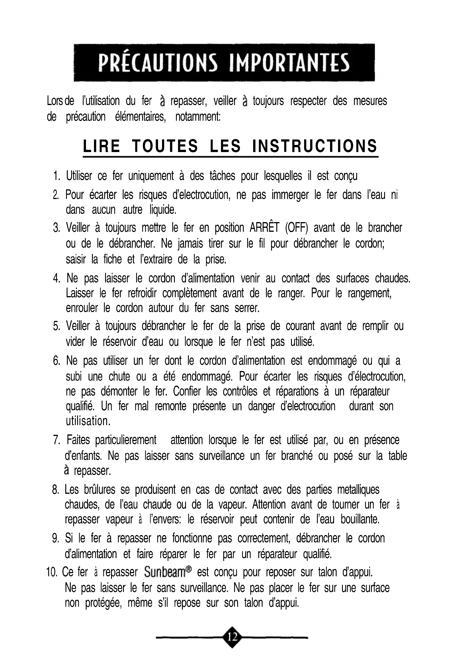 repasser Sunbeam@ est conçu pour reposer sur talon d’appui. Ne pas laisser le fer sans surveillance. Ne pas placer le fer sur une surface non protégée, même s’il repose sur son talon d’appui.INSTRUCTIONS PARTICULIÈRES