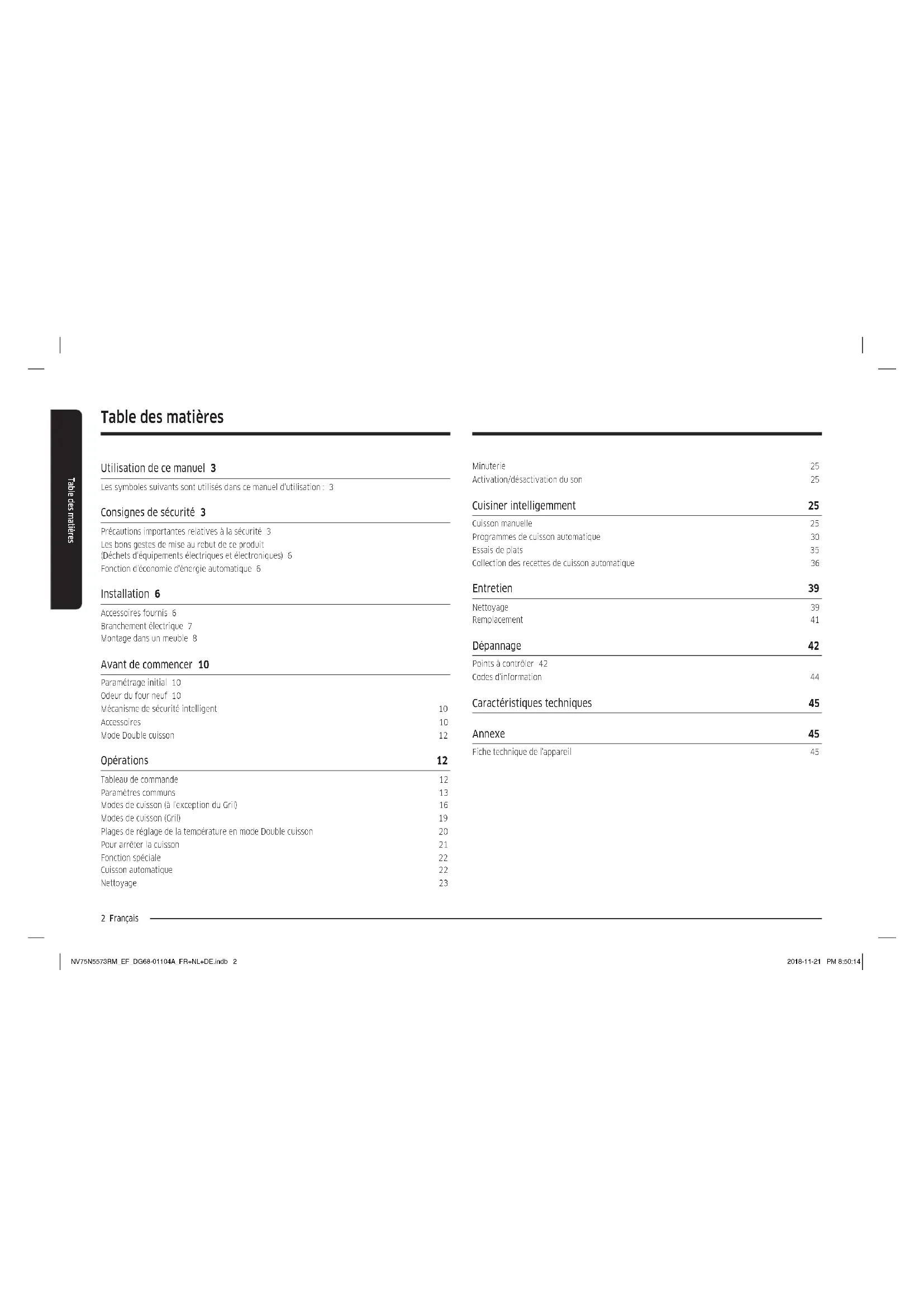 Fiche technique de l'appareil 45 NV75N5573RM_EF_DG68-01104A_FR+NL+DE.indb 2 2018-11-21 PM 8:50:14Français 3 Utilisation de ce manuel Utilisation de ce manuel Merci d'avoir choisi le four encastrable SAMSUNG. Ce manuel d'utilisation contient d'importantes informations relatives à la sécurité ainsi que les instructions de fonctionnement et d'entretien de l'appareil. Veuillez le lire très attentivement avant d'utiliser votre four et conservez-le précieusement en vue d'une consultation ultérieure. Les symboles suivants sont utilisés dans ce manuel d'utilisation : AVERTISSEMENT Risques ou manipulations dangereuses susceptibles d'entraîner des blessures graves, voire mortelles et/ou des dégâts matériels. ATTENTION Risques ou manipulations dangereuses susceptibles d'entraîner des blessures et/ou des dégâts matériels. REMARQUE Astuces utiles, conseils ou informations aidant les utilisateurs à manipuler l'appareil. Consignes de sécurité L'installation de ce four doit être effectuée uniquement par un électricien qualifié. Le technicien est chargé du branchement de l'appareil sur la prise d'alimentation conformément aux conseils de sécurité en vigueur. Précautions importantes relatives à la sécurité AVERTISSEMENT Cet appareil n'est pas conçu pour être utilisé par des personnes (y compris les enfants) dont les capacités physiques, sensorielles ou mentales sont réduites, ou ayant une expérience et des connaissances insuffisantes sur le sujet, sauf si celles-ci sont sous la surveillance de la personne responsable de leur sécurité ou si cette dernière leur a expliqué comment utiliser l'appareil. Les enfants doivent rester sous la surveillance d'un adulte afin de s'assurer qu'ils ne jouent pas avec l'appareil. Le dispositif de sectionnement doit être intégré dans le câblage fixe conformément aux règles de câblage. Cet appareil doit pouvoir être débranché de l'alimentation après installation. Pour que l'appareil puisse être facilement débranché une fois en place, veillez à ce que la prise murale reste accessible ou faites poser un interrupteur sur le câblage fixe, conformément aux normes de câblage. Si le cordon d'alimentation est endommagé, il doit être remplacé par le fabricant, son réparateur agréé ou par toute personne de qualification similaire, afin d'éviter tout danger. NV75N5573RM_EF_DG68-01104A_FR+NL+DE.indb 3 2018-11-21 PM 8:50:144 Français Consignes de sécurité Consignes de sécurité La méthode de fixation indiquée ne doit pas faire usage d'adhésifs car ces derniers ne sont pas considérés comme un moyen de fixation fiable. Cet appareil peut être utilisé par des enfants à partir de 8 ans et des personnes ayant des capacités physiques, sensorielles ou mentales réduites ou un manque d'expérience et de connaissances, uniquement s'ils sont assistés ou si vous leur avez donné les instructions appropriées leur permettant de se servir de l'appareil en toute sécurité et de comprendre les risques encourus. Les enfants ne doivent pas jouer avec l'appareil. Le nettoyage et l'entretien par l'utilisateur de l'appareil ne doivent pas être effectués par un enfant sans surveillance. Maintenez l'appareil et son cordon hors de la portée des enfants âgés de moins de 8 ans. Cet appareil devient très chaud pendant son utilisation. Prenez garde à ne pas toucher les éléments chauffants situés à l'intérieur du four.