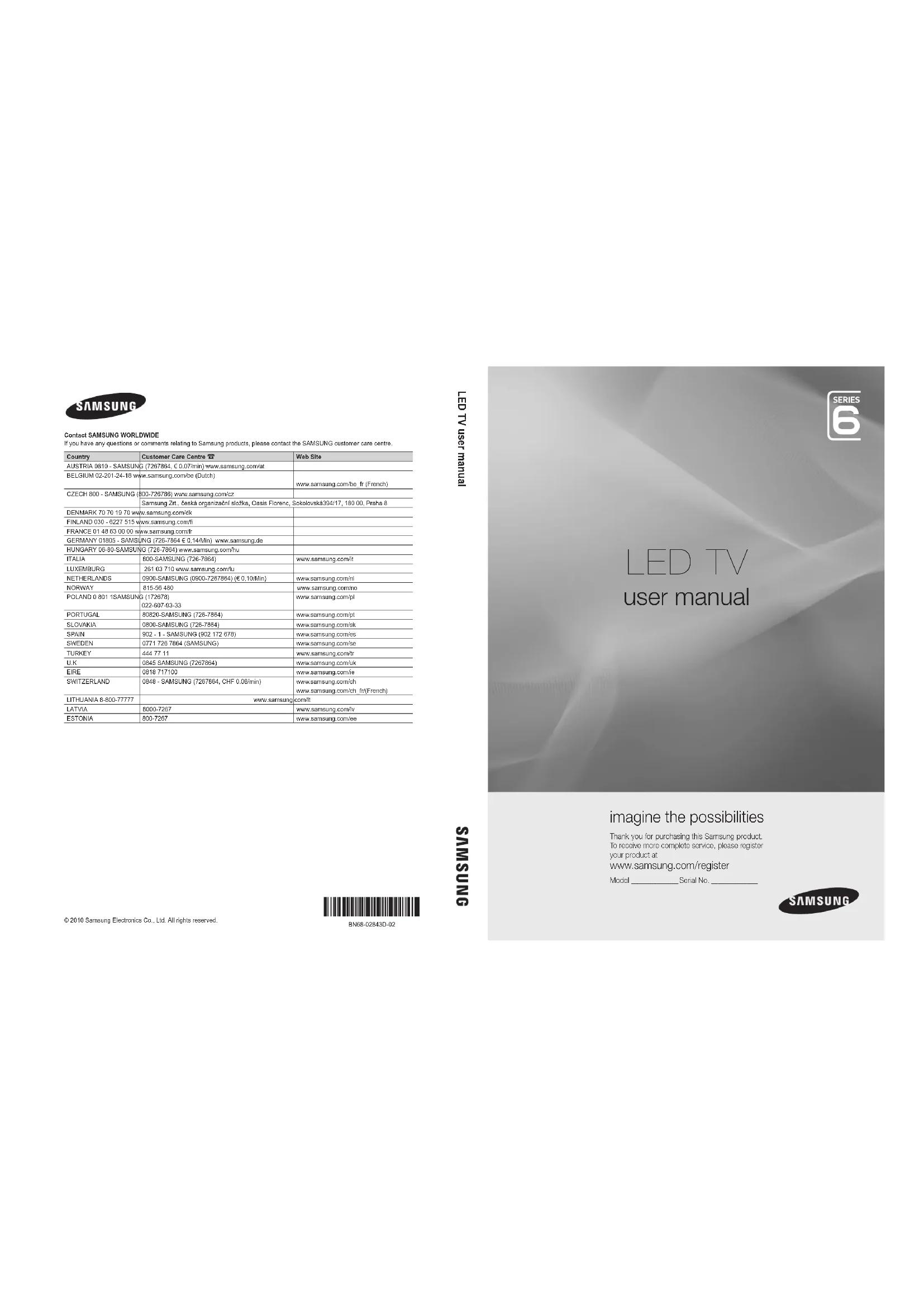 Wall Mount 54 Warm 19 White Balance 18 [UC6900-ZF]BN68-02843D-02L04.indb 62 2010-09-02 오후 1:53:40This page is intentionally left blank. [UC6900-ZF]BN68-02843D-02L04.indb 63 2010-09-02 오후 1:53:402 Français Les figures et illustrations contenues dans ce mode d'emploi sont fournies pour référence uniquement. Elles peuvent différer de l'aspect réel du produit. La conception et les spécifications du produit sont susceptibles d'être modifiées sans préavis. Avis concernant le téléviseur numérique 1. Les fonctions relatives à la télévision numérique (DVB) ne sont disponibles que dans les pays ou régions où des signaux terrestres numériques de type DVB-T (MPEG2 et MPEG4 AVC) sont diffusés ou dans lesquels vous avez accès à un service de télévision par câble compatible DVB-C (MPEG2 et MPEG4 AAC). Consultez votre distributeur local pour connaître les possibilités en matière de réception des signaux DVB-T ou DVB-C. 2. DVB-T est la norme du consortium européen DVB pour la diffusion de signaux terrestres de télévision numérique. La norme DVB-C est, quant à elle, prévue pour la diffusion des signaux de télévision numérique par câble. Certaines fonctions particulières, telles que le guide électronique des programmes (Electric Program Guide - EPG) ou encore la vidéo à la demande (Video On Demand - VOD), ne sont toutefois pas incluses dans cette spécification. Dès lors, elles ne seront pas traitées pour l'instant. 3. Bien que ce téléviseur soit conforme aux dernières normes DVB-T et DVB-C (août 2008), il n'est pas garanti qu'il soit compatible avec les futures diffusions de signaux numériques terrestres DVB-T et par câble DVB-C. 4. En fonction du pays ou de la région où vous vous trouvez, certains opérateurs de télévision par câble peuvent facturer des frais supplémentaires pour un tel service. Il se peut également que vous deviez accepter les termes et conditions de ces sociétés. 5. Il se peut que certaines fonctions de TV numérique ne soient pas disponibles dans certains pays ou certaines régions et que la réception des signaux DVB-C ne soit pas correcte avec tous les opérateurs.