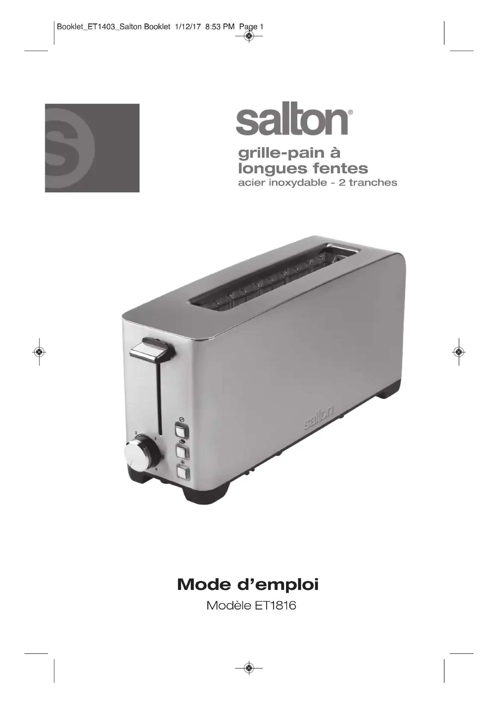 Mode d’emploi Modèle ET1816 Booklet_ET1403_Salton Booklet 1/12/17 8:53 PM Page 1 grille-pain à longues fentes acier inoxydable - 2 tranchesPRECAUTIONS IMPORTANTES Lorsqu’on utilise un appareil électrique, il faut toujours respecter certaines règles de sécurité fondamentales, notamment les suivantes :