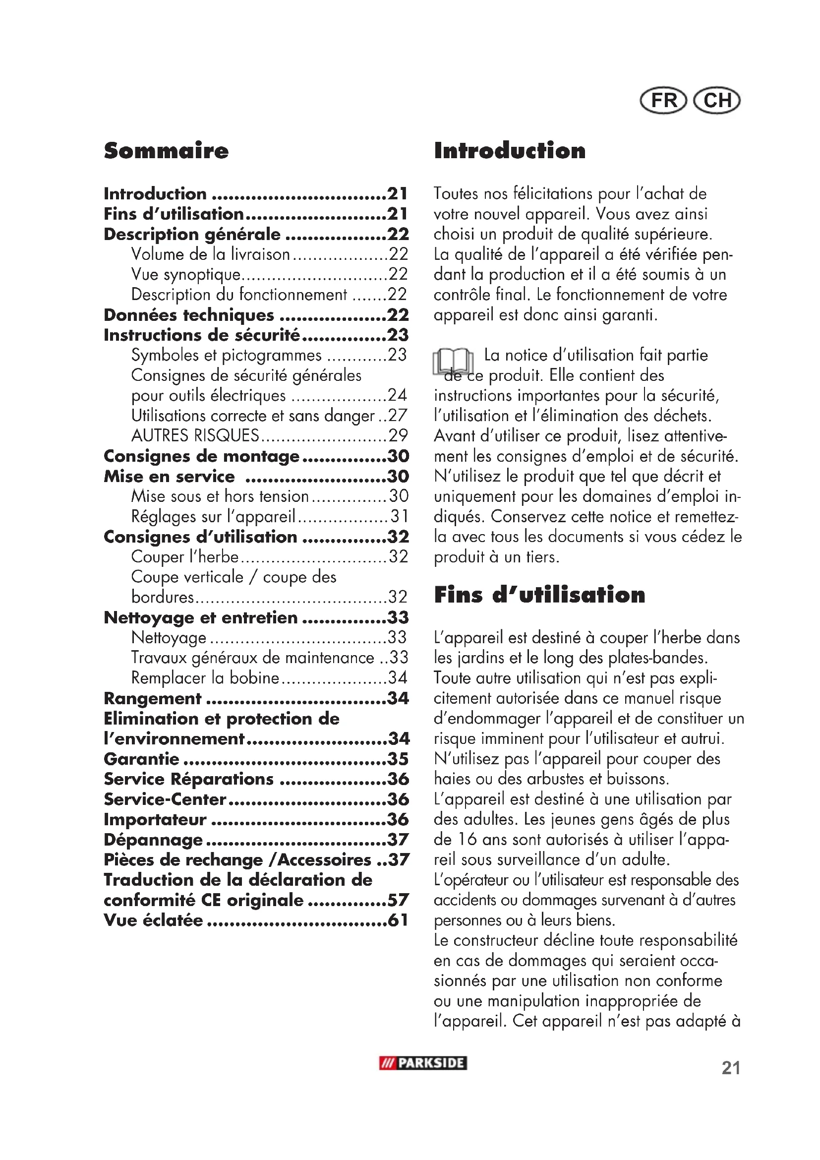 - Vue éclatée Introduction Toutes nos félicitations pour l’achat de votre nouvel appareil. Vous avez ainsi choisi un produit de qualité supérieure. La qualité de l’appareil a été vériée pen- dant la production et il a été soumis à un contrôle nal. Le fonctionnement de votre appareil est donc ainsi garanti. La notice d’utilisation fait partie de ce produit. Elle contient des instructions importantes pour la sécurité, l’utilisation et l’élimination des déchets. Avant d’utiliser ce produit, lisez attentive- ment les consignes d’emploi et de sécurité. N’utilisez le produit que tel que décrit et uniquement pour les domaines d’emploi in- diqués. Conservez cette notice et remettez- la avec tous les documents si vous cédez le produit à un tiers. Fins d’utilisation L’appareil est destiné à couper l’herbe dans les jardins et le long des plates-bandes. Toute autre utilisation qui n’est pas expli- citement autorisée dans ce manuel risque d’endommager l’appareil et de constituer un risque imminent pour l’utilisateur et autrui. N’utilisez pas l’appareil pour couper des haies ou des arbustes et buissons. L’appareil est destiné à une utilisation par des adultes. Les jeunes gens âgés de plus de 16 ans sont autorisés à utiliser l’appa- reil sous surveillance d’un adulte. L’opérateur ou l’utilisateur est responsable des accidents ou dommages survenant à d’autres personnes ou à leurs biens. Le constructeur décline toute responsabilité en cas de dommages qui seraient occa- sionnés par une utilisation non conforme ou une manipulation inappropriée de l’appareil. Cet appareil n’est pas adapté à22 FR CH une utilisation industrielle. Toute utilisation industrielle met n à la garantie. Description générale Vous trouverez la représentation des fonctions les plus impor- tantes sur le volet rabattable au recto et au verso. Volume de la livraison Déballez l’appareil et vériez que la livrai- son est complète : - Coupe-bordures électric - Cache de protection avec deux vis - 2 bobines de l (1x déjà montée, 1x jointe) - Poignée supplémentaire - Notice d’utilisation Vue synoptique 1 Poignée supérieure 2 Interrupteur Marche/Arrêt 3 Câble d‘alimentation 4 Dispositif anti-traction 5 Déverrouillage (rotation élément de poignée) 6 Douille (réglage longueur tube télescopique) 7 Tube télescopique 8 Bouton-poussoir (angle d‘inclinai- son tête du moteur) 9 Cache de protection 10 Capsule 11 Étrier d‘écartement (protection des eurs) 12 Tête du moteur 13 Élément de poignée 14 Écrou (vis à poignée supplémen- taire) 15 Poignée supplémentaire 16 Vis (cache de protection) 17 Logement de poignée 18 Vis à poignée (poignée supplé- mentaire) 19 Déverrouillage (capsule) 20 Bobine de l 21 Coupe-l 22 Œillet de sortie de l 23 Fente (bobine de l) 24 Bouton d‘arrêt (bobine de l) Description du fonctionnement La débroussailleuse électrique manuelle et portative possède une bobine de l en tant que dispositif de découpe. De plus l‘appareil est équipé d‘une tête de moteur pivotante, d‘un manche téles- copique en alu orientable et d‘un étrier d‘écartement. Pour assurer la protection de l’utilisateur, l’appareil est équipé d’un carter de protec- tion qui recouvre le dispositif de coupe. En ce qui concerne le fonctionnement des éléments de commande, veuillez lire les descriptions suivantes. Données techniques Coupe-bordures électric p. 61