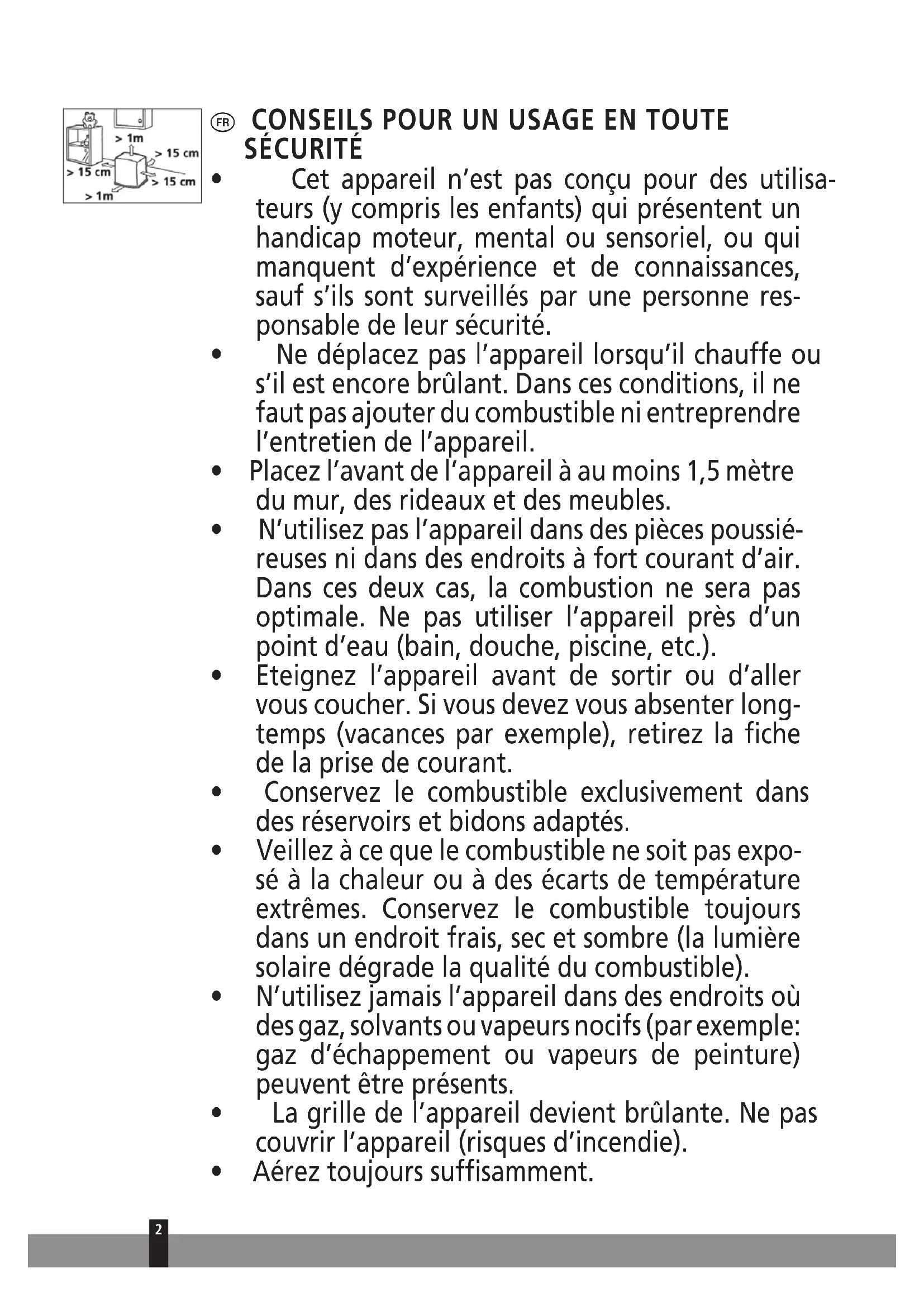 - N’utilisez pas l’appareil dans des pièces poussié- reuses ni dans des endroits à fort courant d’air. Dans ces deux cas, la combustion ne sera pas optimale. Ne pas utiliser l’appareil près d’un point d’eau (bain, douche, piscine, etc.).