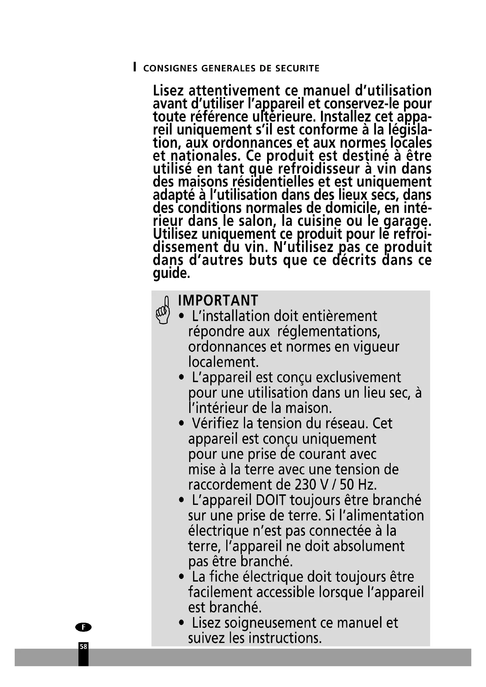 145 x 865 x 471 295 x 870 x 575 590 x 455 x 557 595 x 870 x 575 598 x 1200 x 690 598 x 1600 x 690 598 x 1923 x 690 Peso (kg) 19 31,5 27 43 69 82 100 Protección de la unidad IP X0 Agente de expansión aislante CiclopentanoI CONSIGNES GENERALES DE SECURITE Lisez attentivement ce manuel d’utilisation avant d’utiliser l’appareil et conservez-le pour toute référence ultérieure. Installez cet appa- reil uniquement s’il est conforme à la législa- tion, aux ordonnances et aux normes locales et nationales. Ce produit est destiné à être utilisé en tant que refroidisseur à vin dans des maisons résidentielles et est uniquement adapté à l’utilisation dans des lieux secs, dans des conditions normales de domicile, en inté- rieur dans le salon, la cuisine ou le garage. Utilisez uniquement ce produit pour le refroi- dissement du vin. N’utilisez pas ce produit dans d’autres buts que ce décrits dans ce guide.