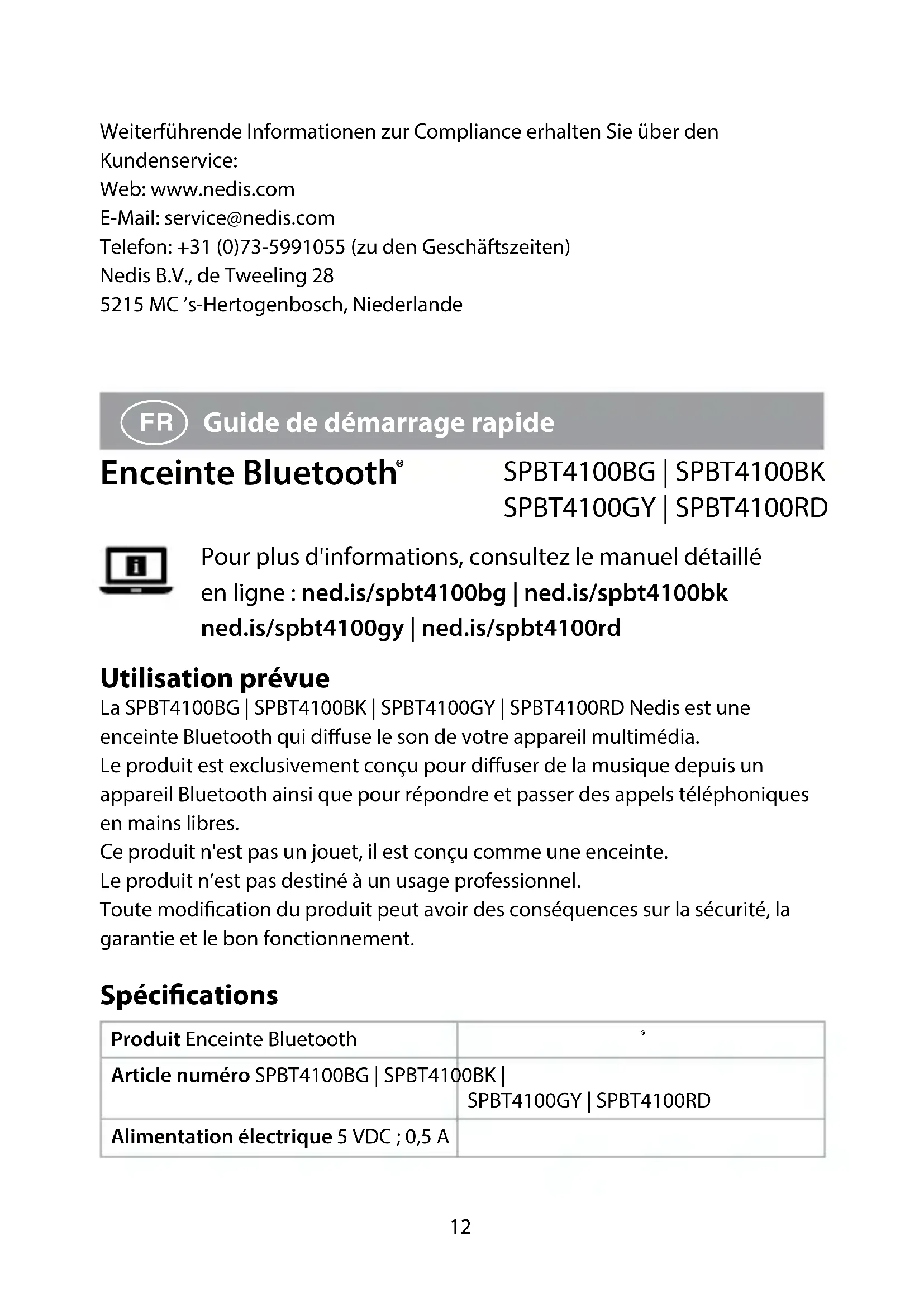 , produit en Chine, a été testé conformément à toutes les normes et réglementations CE en vigueur et que tous les tests ont été réussis. Cela inclut, sans toutefois s'y limiter, la directive RED 2014/53/UE. La Déclaration de conformité complète (et la che de sécurité le cas échéant) peut être trouvée et téléchargée via: webshop.nedis.com/spbt4100bg#support via webshop.nedis.fr/spbt4100bk#support via webshop.nedis.fr/spbt4100gy#support webshop.nedis.com/spbt4100rd#support Pour plus d'informations sur la conformité, contactez le service client: Site Web: www.nedis.com E-mail: service@nedis.com Téléphone: +31 (0)73-5991055 (pendant les heures de bureau) Nedis B.V., de Tweeling 28 5215 MC ’s-Hertogenbosch, Pays-Bas