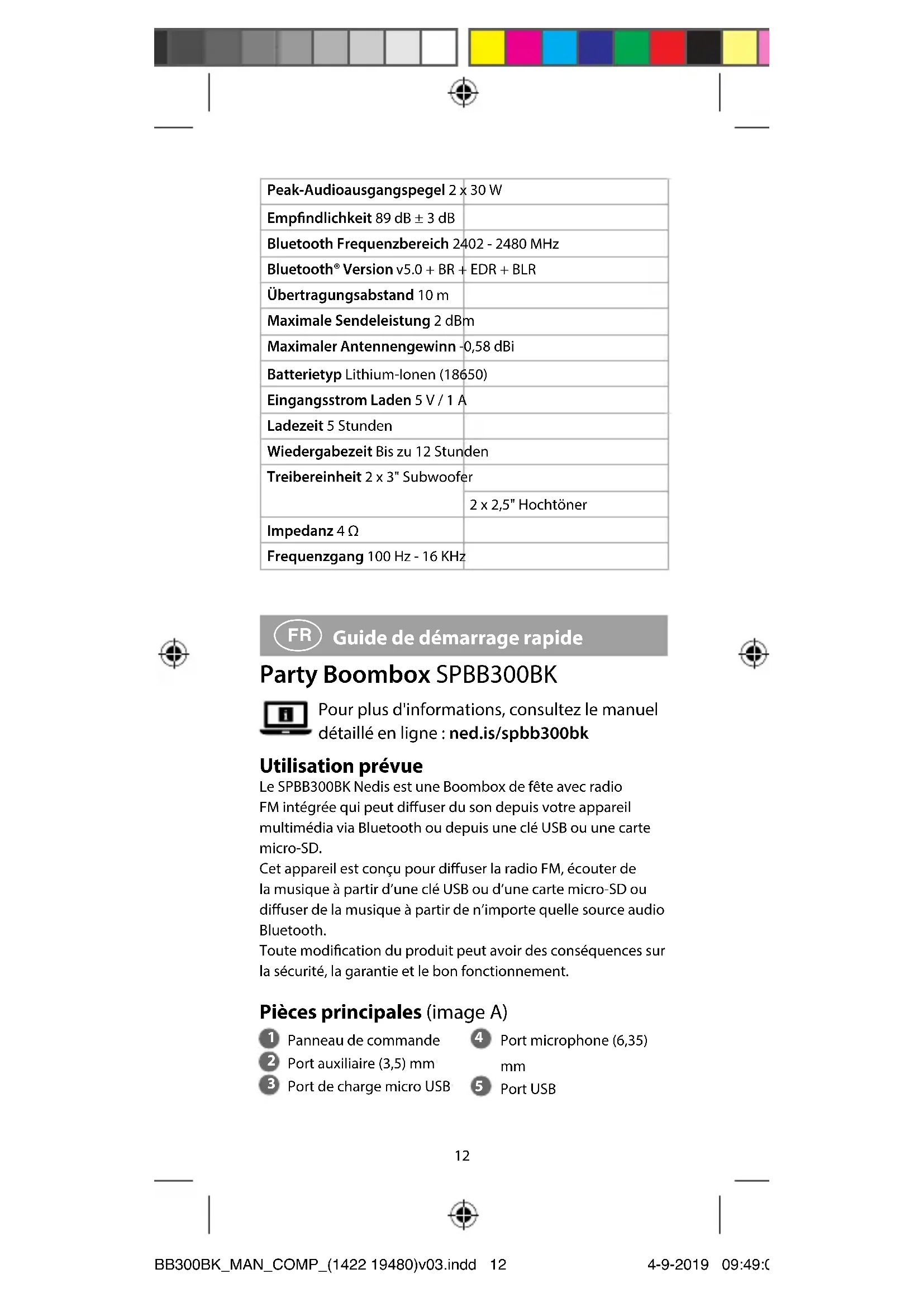 SPBB300BK_MAN_COMP_(1422 19480)v03.indd 15 4-9-2019 09:49:0916 Spécications Produit Party Boombox Article numéro SPBB300BK Dimensions (L x l x H) 444 x 158 x 199 mm Poids 2,6 kg Canaux Stéréo Puissance audio RMS 2 x 13 W Puissance audio de crête 2 x 30 W Sensibilité 89 dB ± 3 dB Gamme de fréquence Bluetooth 2402 - 2480 MHz Version Bluetooth® v5.0 + BR + EDR + BLR Distance de transmission 10 m Puissance de transmission maximale 2 dBm Gain d’antenne maximal -0,58 dBi Type de batterie Lithium-ion (18650) Puissance d’entrée de charge 5 V / 1 A Temps de recharge 5 heures Autonomie en lecture Jusqu'à 12 heures Moteur Subwoofer 2 x 3" Tweeter 2 x 2,5" Impédance 4 Ω Réponse en fréquence 100 Hz - 16 KHz