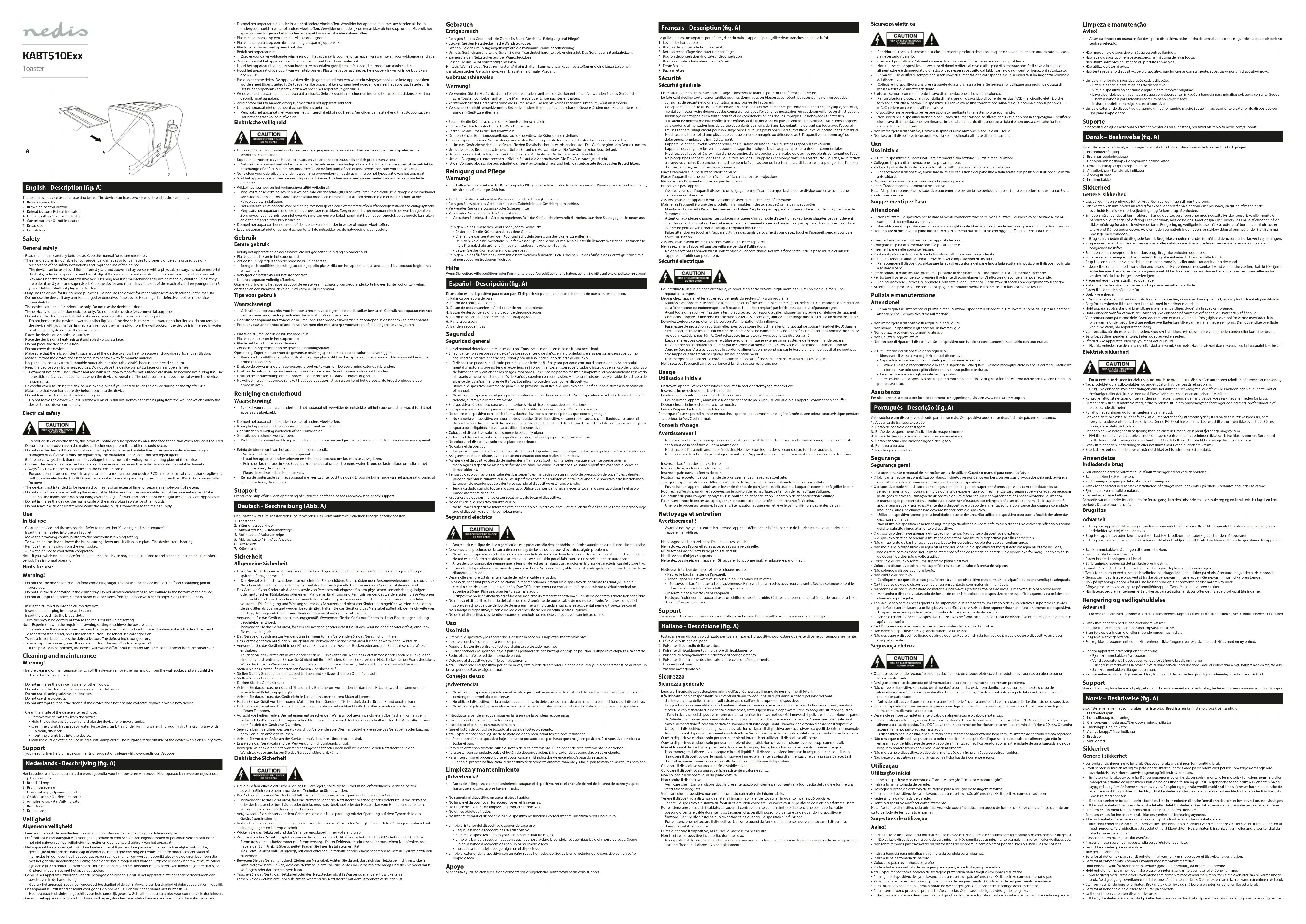 - Antes de la limpieza o el mantenimiento, apague el dispositivo, retire el enchufe de red de la toma de pared y espere hasta que el dispositivo se haya enfriado.• No sumerja el dispositivo en agua ni otros líquidos.• No limpie el dispositivo ni los accesorios en el lavavajillas.• No utilice disolventes de limpieza ni productos abrasivos.• No utilice objetos alados.• No intente reparar el dispositivo. Si el dispositivo no funciona correctamente, sustitúyalo por uno nuevo.• Limpie el interior del dispositivo después de cada uso:• Saque la bandeja recogemigas del dispositivo.• Sujete el dispositivo al revés y sacúdalo para quitar las migas.• Limpie la bandeja recogemigas con agua jabonosa. Aclare la bandeja recogemigas bajo el chorro de agua. Seque bien la bandeja recogemigas con un paño limpio y seco.• Introduzca la bandeja recogemigas en el dispositivo.• Limpie el exterior del dispositivo con un paño suave humedecido. Seque bien el exterior del dispositivo con un paño limpio y seco. Apoyo Si necesita ayuda adicional o si tiene comentarios o sugerencias, visite www.nedis.com/support Français - Description (g. A) Le grille-pain est un appareil pour faire griller du pain. L'appareil peut griller deux tranches de pain à la fois.1. Levier de chariot de pain2. Bouton de commande brunissement3. Bouton réchauage /Indicateur réchauage4. Bouton décongélation /Indicateur décongélation5. Bouton annuler / Indicateur marche/arrêt6. Fente à pain7. Bac à miettes Sécurité Sécurité générale