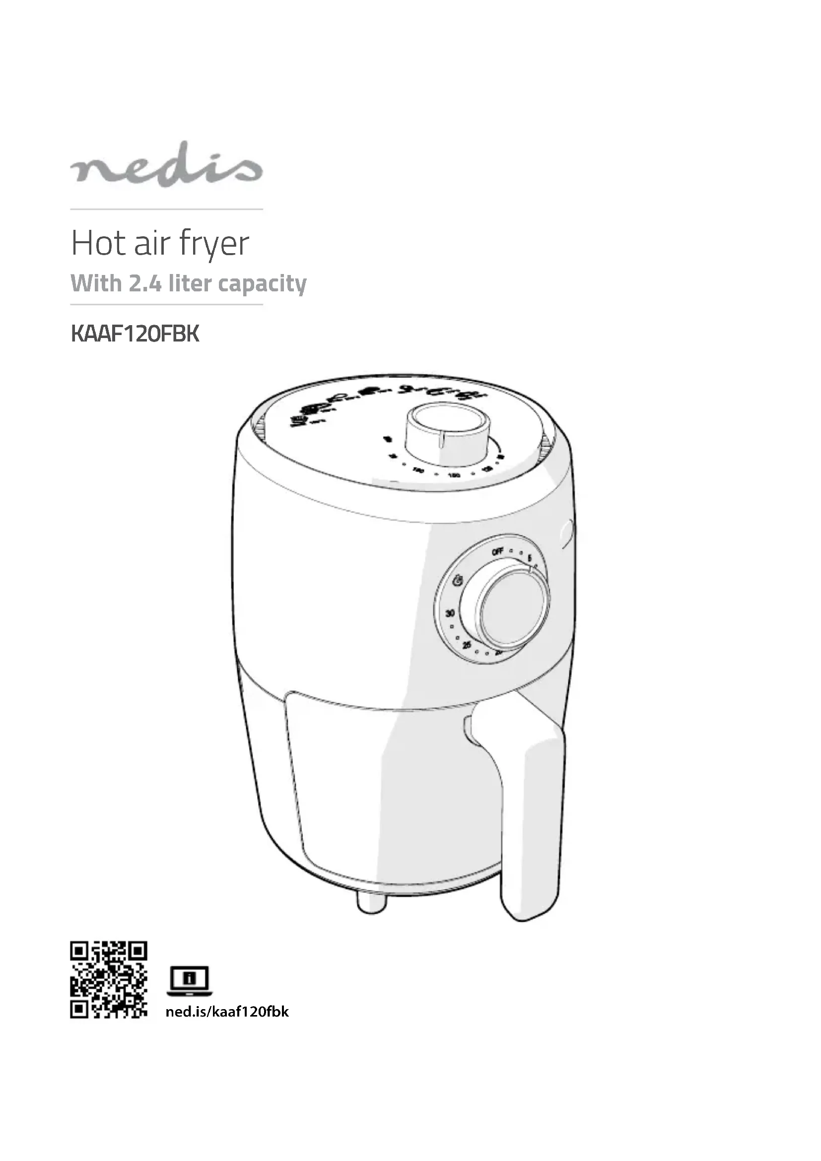 Guide de démarrage rapide Friteuse à air chaud KAAF120FBK Pour plus d'informations, consultez le manuel détaillé en ligne: ned.is/kaaf120fbk Utilisation prévue La KAAF120FBK Nedis est une friteuse à air chaud d’une capacité de 2,4 L.Ce produit est destiné à être utilisé dans des applications domestiques et similaires telles que des cuisines.Ce produit peut être utilisé par des enfants âgés de 8 ans et plus ainsi que des personnes ayant des capacités physiques, sensorielles ou mentales réduites ou manquant d’expérience et de connaissances s’ils sont supervisés ou ont reçu des instructions sur l’utilisation du produit en toute sécurité et comprennent les dangers impliqués. Les enfants ne doivent pas jouer avec le produit. Le nettoyage et la maintenance ne doivent pas être eectués par des enfants sans surveillance.Le produit est prévu pour un usage intérieur uniquement.Le produit n’est pas destiné à un usage professionnel.Toute modication du produit peut avoir des conséquences sur la sécurité, la garantie et le bon fonctionnement. Spécications Produit Friteuse à air chaudArticle numéro KAAF120FBKDimensions (L x l x H) 269 x 215 x 305 mmPoids 2590 gAlimentation électrique220 - 240 VAC ; 50 / 60 HzPuissance de chaue 1000 WPuissance du moteur 20 WTemps de fonctionnement nominal60 min• Stellen Sie sicher, dass die Schale vollständig eingesetzt ist, wenn das Produkt in Betrieb ist.• Jegliche Modikation des Produkts kann Folgen für die Sicherheit, Garantie und ordnungsgemäße Funktionalität haben. Vor der Inbetriebnahme