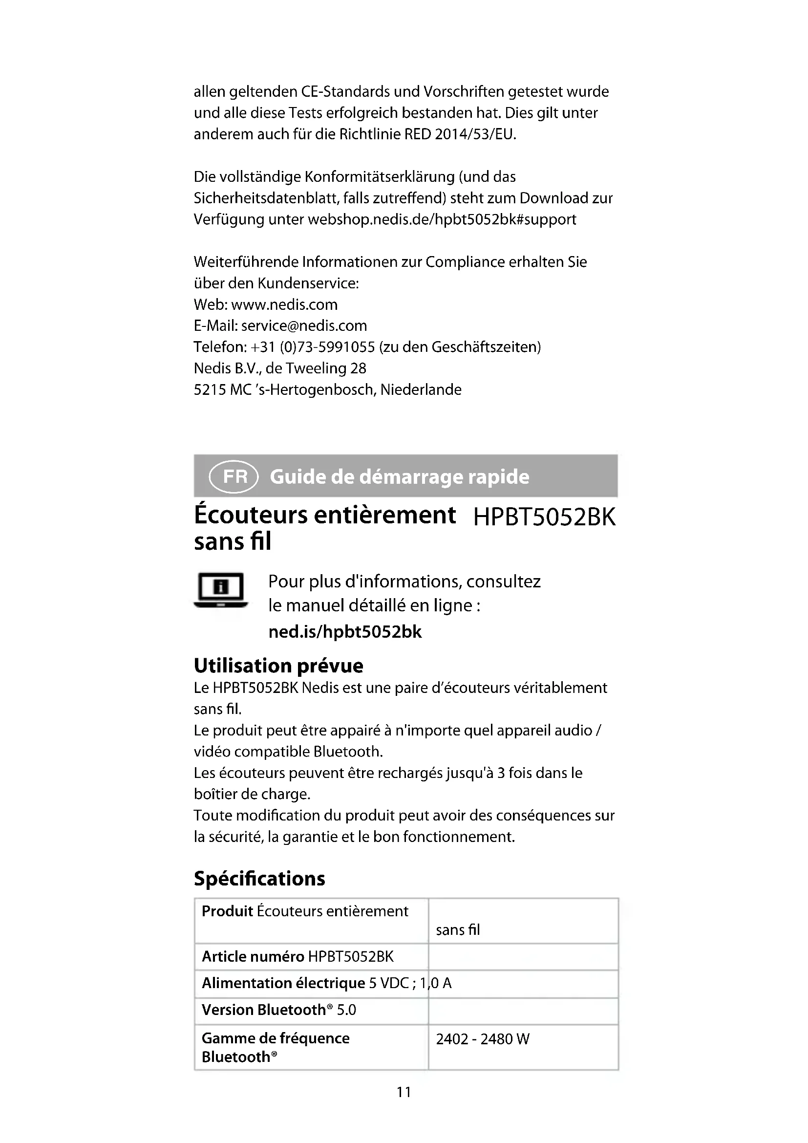 et fermez le couvercle A pour charger les écouteurs.6. A sur les écouteurs s'allume en rouge.7. A s'éteint une fois les écouteurs complètement chargés. Les écouteurs et le boîtier de recharge peuvent se charger simultanément. Déclaration de conformité Nous, Nedis B.V., déclarons en tant que fabricant que le produit HPBT5052BK de notre marque Nedis , produit en Chine, a été testé conformément à toutes les normes et réglementations CE en vigueur et que tous les tests ont été réussis. Cela inclut, sans toutefois s'y limiter, la directive RED 2014/53/UE.La Déclaration de conformité complète (et la che de sécurité le cas échéant) peut être trouvée et téléchargée via webshop.nedis.fr/hpbt5052bk#supportPour plus d'informations sur la conformité, contactez le service client:Site Web: www.nedis.comE-mail: service@nedis.comTéléphone: +31 (0)73-5991055 (pendant les heures de bureau)Nedis B.V., de Tweeling 285215 MC ’s-Hertogenbosch, Pays-Bas