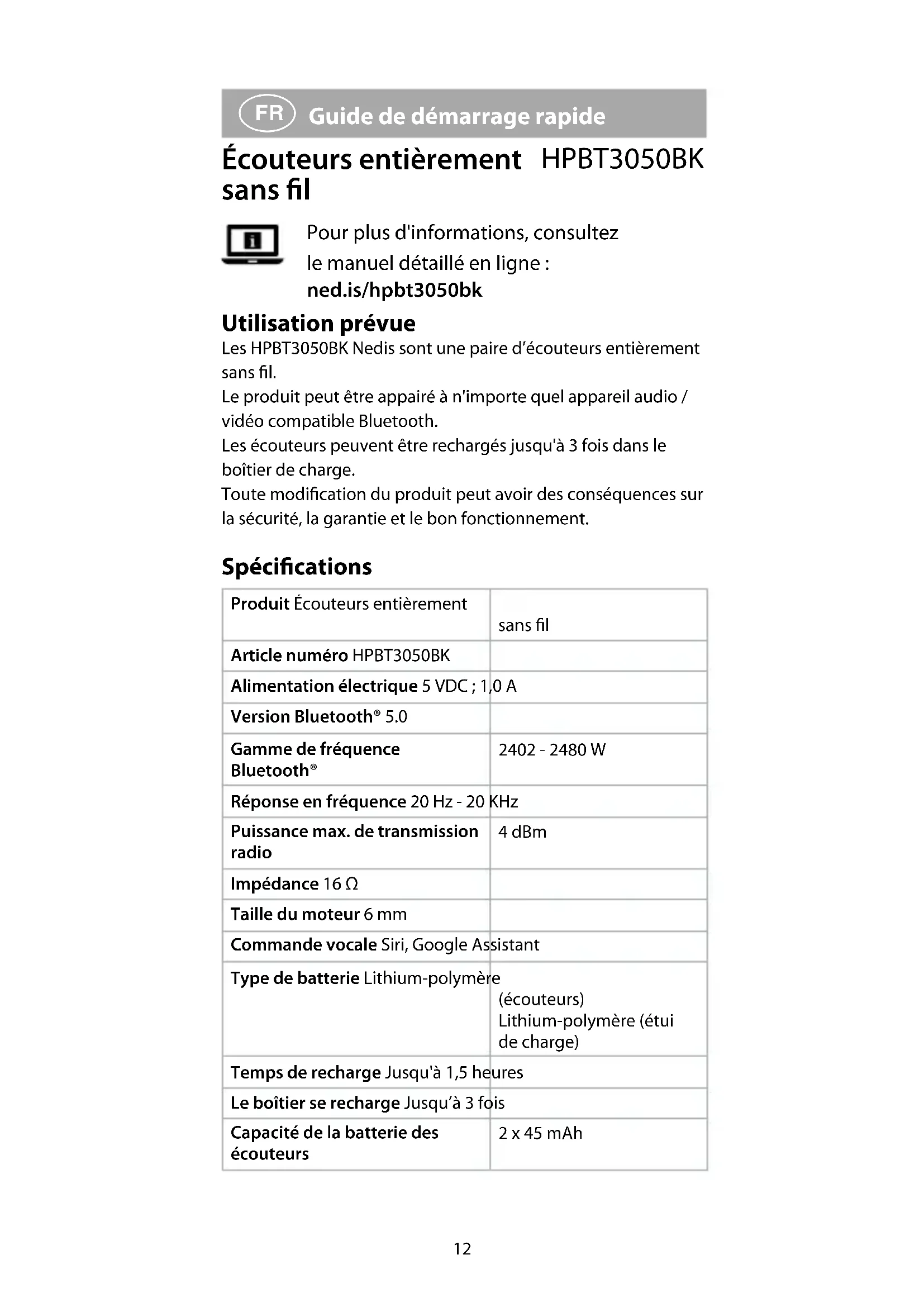 Guide de démarrage rapide Écouteurs entièrement sans l HPBT3050BK Pour plus d'informations, consultez le manuel détaillé en ligne: ned.is/hpbt3050bk Utilisation prévue Les HPBT3050BK Nedis sont une paire d’écouteurs entièrement sans l. Le produit peut être appairé à n'importe quel appareil audio / vidéo compatible Bluetooth. Les écouteurs peuvent être rechargés jusqu'à 3 fois dans le boîtier de charge. Toute modication du produit peut avoir des conséquences sur la sécurité, la garantie et le bon fonctionnement. Spécications Produit Écouteurs entièrement sans l Article numéro HPBT3050BK Alimentation électrique 5 VDC ; 1,0 A Version Bluetooth® 5.0 Gamme de fréquence Bluetooth® 2402 - 2480 W Réponse en fréquence 20 Hz - 20 KHz Puissance max. de transmission radio 4 dBm Impédance 16 Ω Taille du moteur 6 mm Commande vocale Siri, Google Assistant Type de batterie Lithium-polymère (écouteurs) Lithium-polymère (étui de charge) Temps de recharge Jusqu'à 1,5 heures Le boîtier se recharge Jusqu’à 3 fois Capacité de la batterie des écouteurs 2 x 45 mAh13 Capacité de la batterie du boîtier de charge 300 mAh Temps de diusion Jusqu'à 3 heures Étanche Non Commande tactile Oui Pièces principales (image A)