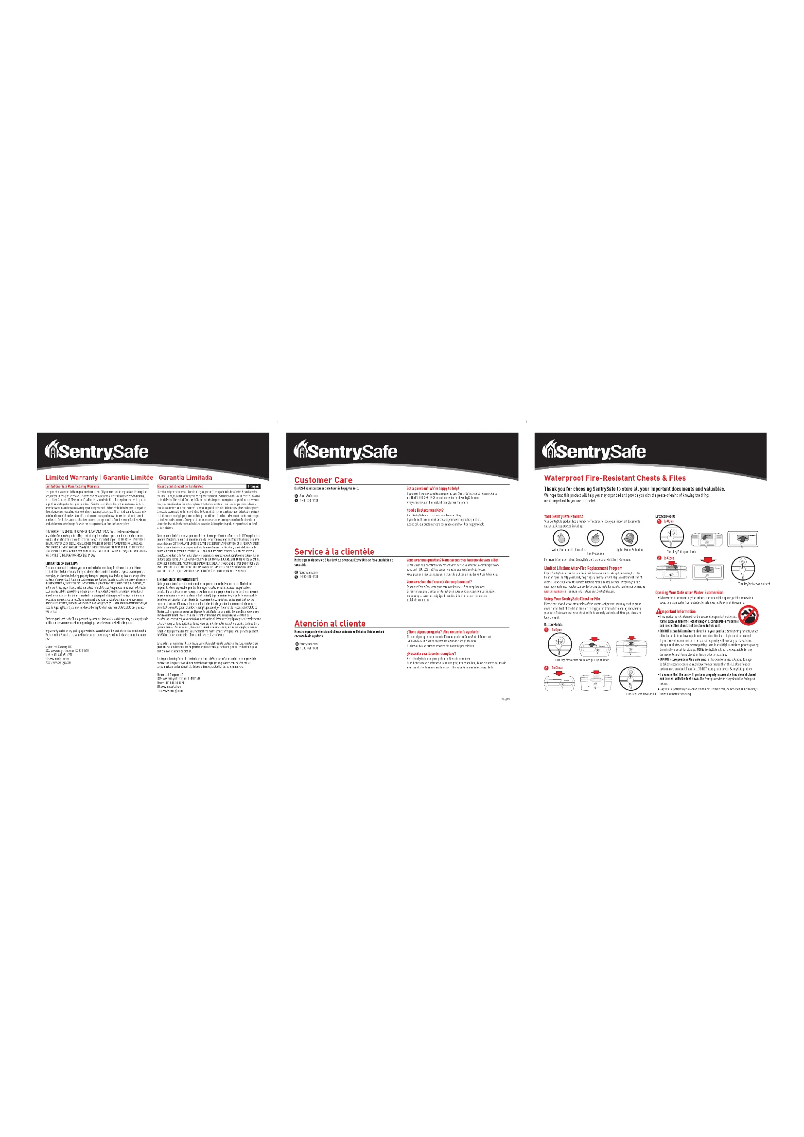 1-800-828-1438Vous avez besoin d’une clé de remplacement?Consultez SentrySafe.com pour commander une clé de remplacement. Si vous n’avez pas d’accès à Internet ou si vous avez une question particulière, communiquez avec notre équipe du service à la clientèle et il nous fera plaisir de vous aider.Vous avez une question? Nous serons très heureux de vous aider! Si vous avez des questions concernant votre coffre SentrySafe, communiquez avec nous au 1-800-828-1438 ou consultez notre site Web SentrySafe.com. Nous pourrons résoudre plusieurs types de problèmes rapidement par téléphone. Atención al cliente Nuestro equipo de atención al cliente ubicado en Estados Unidos estará encantado de ayudarlo.