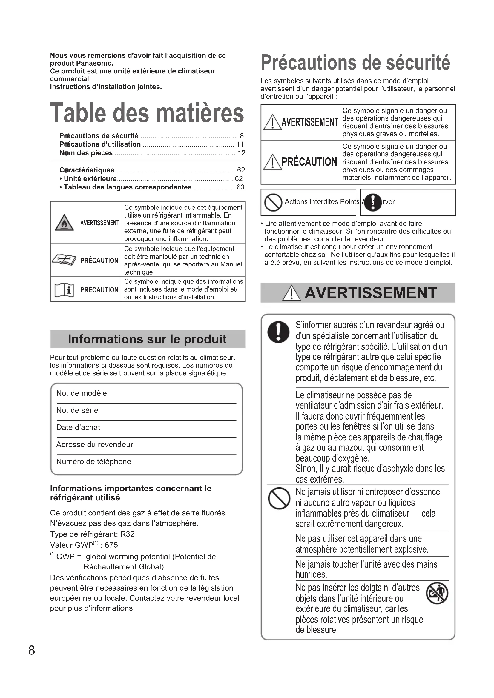 - Tableau des langues correspondantes ..................... 63 Table des matières Précautions de sécurité Informations sur le produit Pour tout problème ou toute question relatifs au climatiseur, les informations ci-dessous sont requises. Les numéros de modèle et de série se trouvent sur la plaque signalétique.No. de modèle No. de série Date d’achatAdresse du revendeurNuméro de téléphoneS’informer auprès d’un revendeur agréé ou d’un spécialiste concernant l’utilisation du type de réfrigérant spécié. L’utilisation d’un type de réfrigérant autre que celui spécié comporte un risque d’endommagement du produit, d’éclatement et de blessure, etc.Le climatiseur ne possède pas de ventilateur d’admission d’air frais extérieur. Il faudra donc ouvrir fréquemment les portes ou les fenêtres si l’on utilise dans la même pièce des appareils de chauffage à gaz ou au mazout qui consomment beaucoup d’oxygène. Sinon, il y aurait risque d’asphyxie dans les cas extrêmes.Ne jamais utiliser ni entreposer d’essence ni aucune autre vapeur ou liquides inammables près du climatiseur — cela serait extrêmement dangereux.Ne pas utiliser cet appareil dans une atmosphère potentiellement explosive.Ne jamais toucher l’unité avec des mains humides.Ne pas insérer les doigts ni d’autres objets dans l’unité intérieure ou extérieure du climatiseur, car les pièces rotatives présentent un risque de blessure.Les symboles suivants utilisés dans ce mode d’emploi avertissent d’un danger potentiel pour l’utilisateur, le personnel d’entretien ou l’appareil : AVERTISSEMENT Ce symbole signale un danger ou des opérations dangereuses qui risquent d’entraîner des blessures physiques graves ou mortelles. PRÉCAUTION Ce symbole signale un danger ou des opérations dangereuses qui risquent d’entraîner des blessures physiques ou des dommages matériels, notamment de l’appareil.Actions interdites Points à observer• Lire attentivement ce mode d’emploi avant de faire fonctionner le climatiseur. Si l’on rencontre des difcultés ou des problèmes, consulter le revendeur.• Le climatiseur est conçu pour créer un environnement confortable chez soi. Ne l’utiliser qu’aux ns pour lesquelles il a été prévu, en suivant les instructions de ce mode d’emploi. AVERTISSEMENT Nous vous remercions d’avoir fait l’acquisition de ce produit Panasonic.Ce produit est une unité extérieure de climatiseur commercial.Instructions d’installation jointes.AVERTISSEMENTCe symbole indique que cet équipement utilise un réfrigérant inammable. En présence d'une source d'inammation externe, une fuite de réfrigérant peut provoquer une inammation.PRÉCAUTIONCe symbole indique que l'équipement doit être manipulé par un technicien après-vente, qui se reportera au Manuel technique.PRÉCAUTIONCe symbole indique que des informations sont incluses dans le mode d’emploi et/ou les Instructions d’installation.Informations importantes concernant le réfrigérant utiliséCe produit contient des gaz à effet de serre uorés. N’évacuez pas des gaz dans l’atmosphère.Type de réfrigérant: R32Valeur GWP (1) : 675 (1) GWP = global warming potential (Potentiel de Réchauffement Global)Des vérications périodiques d’absence de fuites peuvent être nécessaires en fonction de la législation européenne ou locale. Contactez votre revendeur local pour plus d’informations. OI_00_302355_all.indb 8 2018/9/20 10:01:269 FRANÇAIS AVERTISSEMENT Le contact du réfrigérant avec une amme peut produire un gaz toxique. Par mesure de sécurité, éteindre le climatiseur et le débrancher aussi de la prise secteur avant son nettoyage ou entretien. Débrancher la prise d’alimentation de la prise secteur, ou désactiver le disjoncteur ou désactiver le dispositif de déconnexion de l’alimentation an d’isoler le climatiseur de l’alimentation principale en cas d’urgence. Mettez au rebut conformément aux lois nationales et/ou locales. Ce produit ne doit en aucune circonstance être modié ou démonté. Une unité modiée ou démontée peut provoquer un incendie, une électrocution ou des blessures. Les utilisateurs ne doivent pas nettoyer l’intérieur des unités intérieures et extérieures. Faire appel à un revendeur agréé ou à un spécialiste pour le nettoyage. En cas de dysfonctionnement de cet appareil, ne pas le réparer soi-même. Prenez contact avec le revendeur ou un SAV pour la réparation et la mise au rebut. L'appareil doit être stocké dans une pièce sans sources d'allumage utilisées en continu (par exemple, ammes nues, appareil à gaz en marche ou chauffage électrique en marche). Attention, certains réfrigérants ne contiennent pas d'agent odorant. Si l’appareil utilisant des réfrigérants inammables est installé dans une zone non ventilée, celle-ci doit être agencée de manière à ce que les éventuelles fuites de réfrigérant ne stagnent pas pour ne pas entraîner de risque d’incendie ou d’explosion. L’appareil doit être stocké dans un endroit bien ventilé, dans une pièce d’une supercie correspondant à celle spéciée pour l’utilisation. Après avoir installé l’unité, demandez impérativement à l’installateur l’espace au sol de la pièce où l’unité est installée et la quantité de charge du réfrigérant. En cas de changement d’unité ou de cloison de séparation, consultez impérativement le revendeur ou le dépanneur. N'utiliser aucun dispositif autre que ceux recommandés par le fabricant pour accélérer le processus de dégivrage. Ne pas percer ni brûler. Si une ventilation mécanique est né- cessaire, les évents ne doivent pas être obstrués. Ne pas utiliser de cordon, de rallonge ou de cordon non spécié an d’éviter tout risque de surchauffe et d’incendie. Prévoyez une prise électrique à utiliser exclusivement pour chaque unité, et prévoyez un dispositif de déconnexi